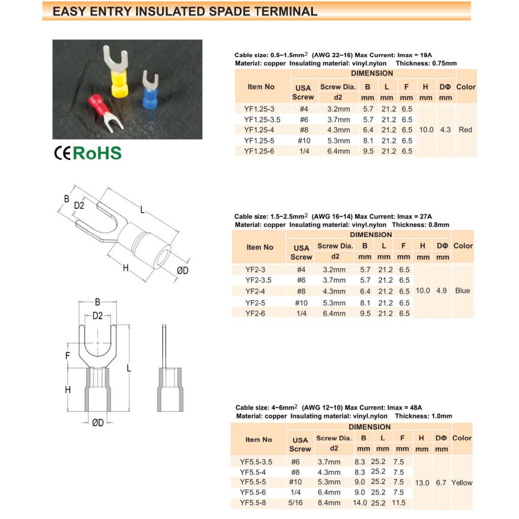 1.5mm 2.5mm 4mm 6mm non insulated & Insulated spade terminal Y lug U lug terminal connector - 100pcs