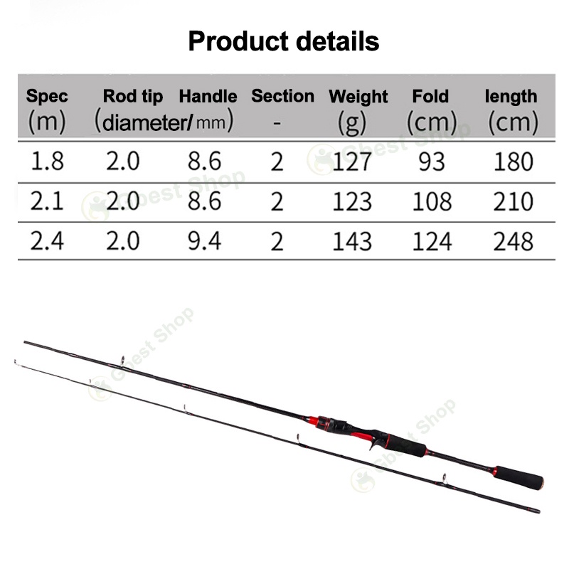 1.8M/2.1M/2.4M Fishing Rod stick spinning solid carbon fiber Casting Rod 2 Section telescopic Light Baitcasting Pancing
