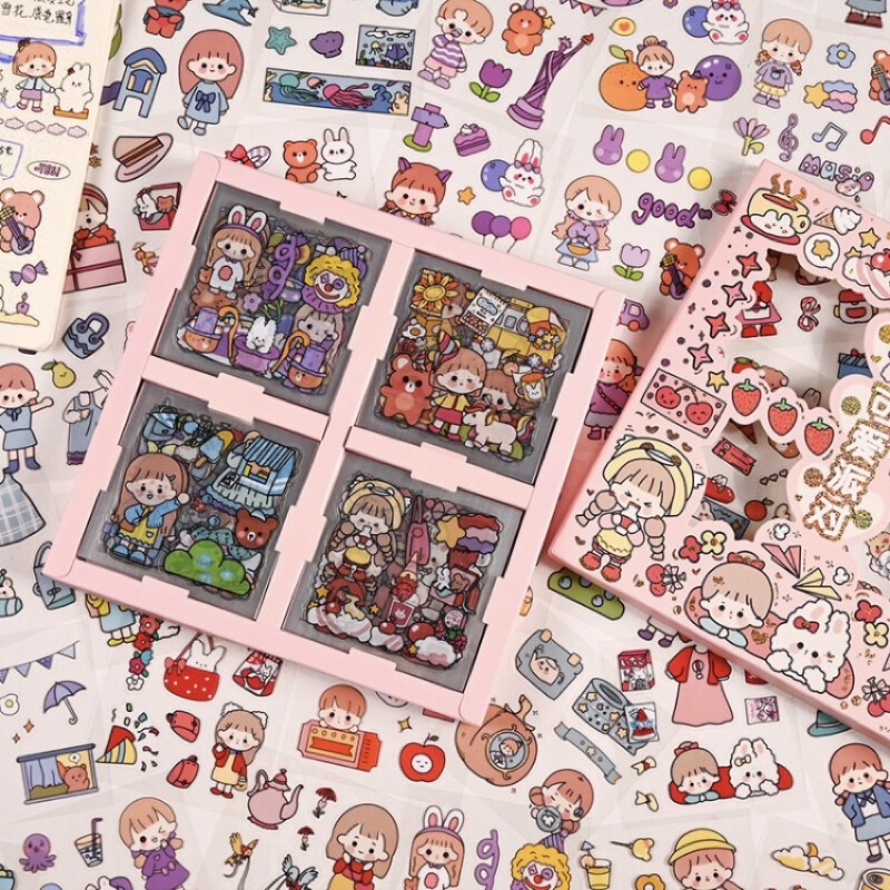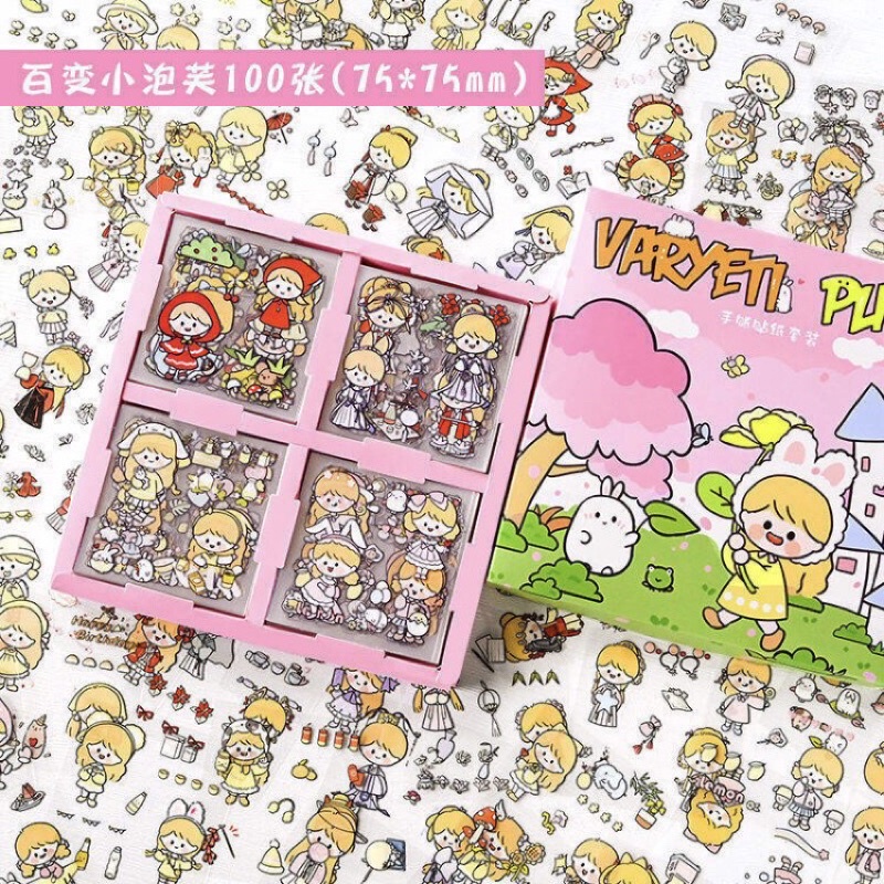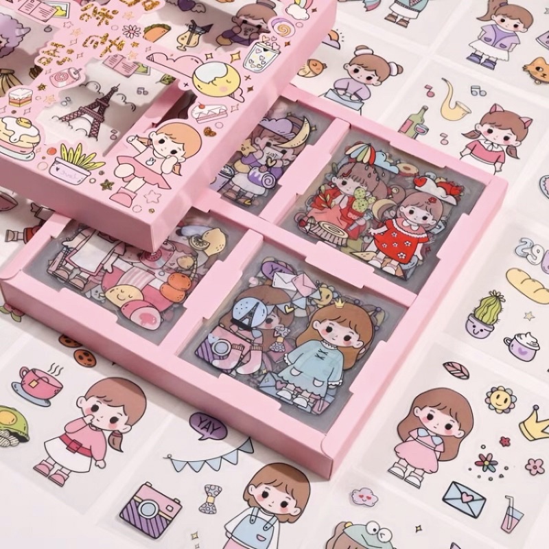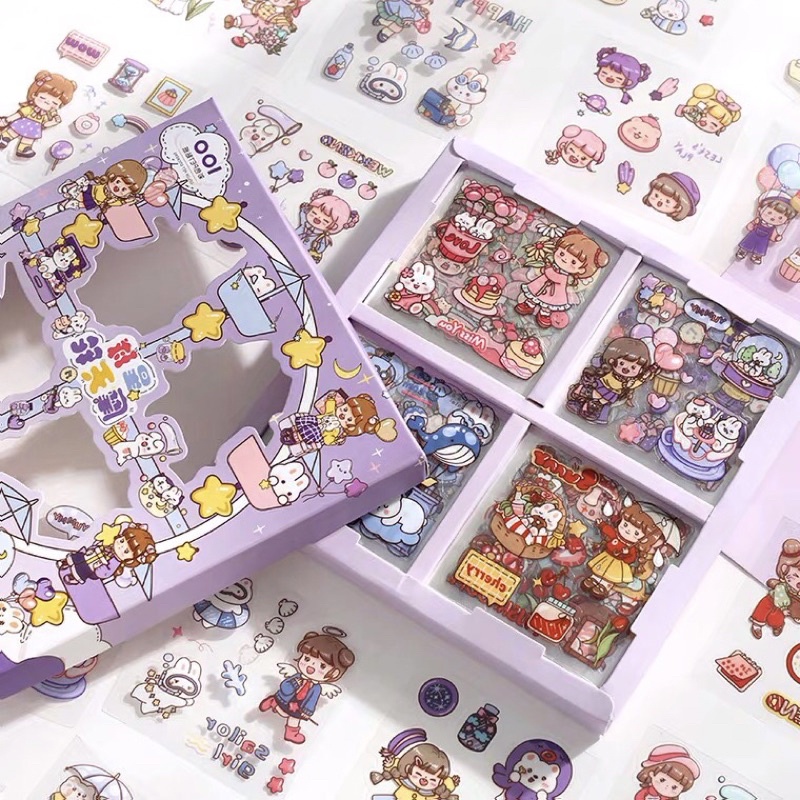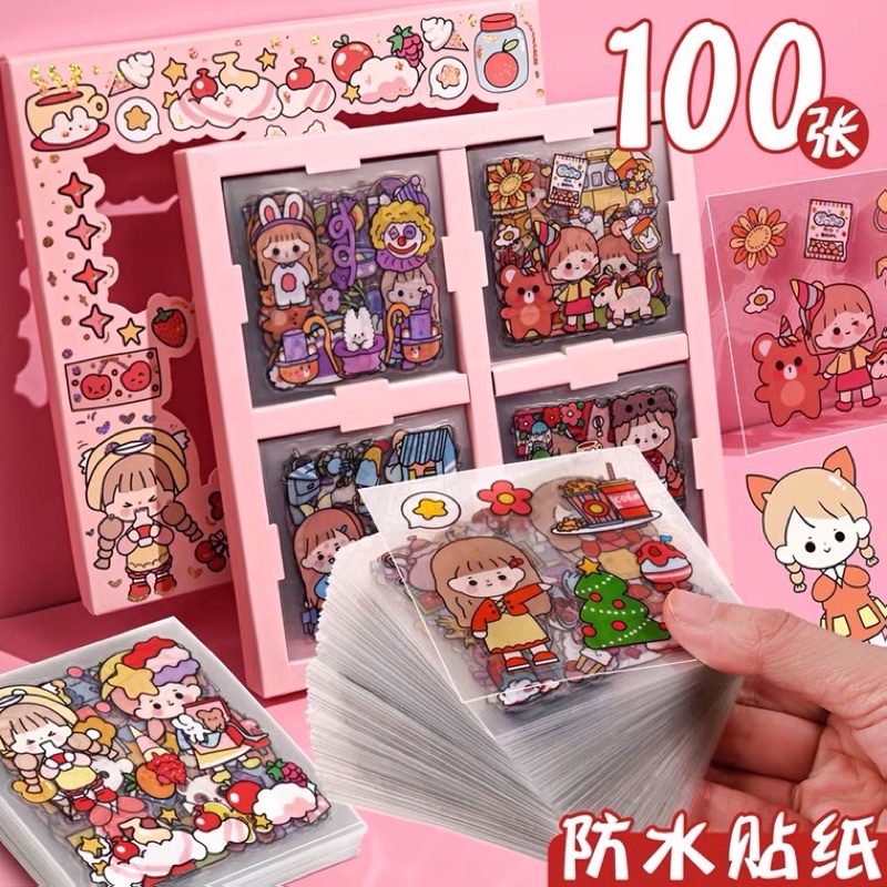 100pcs Cartoon Journal Stickers Gift Box Cute Non-Repeating Stickers Waterproof Material Notebook Diary DIY Stationery