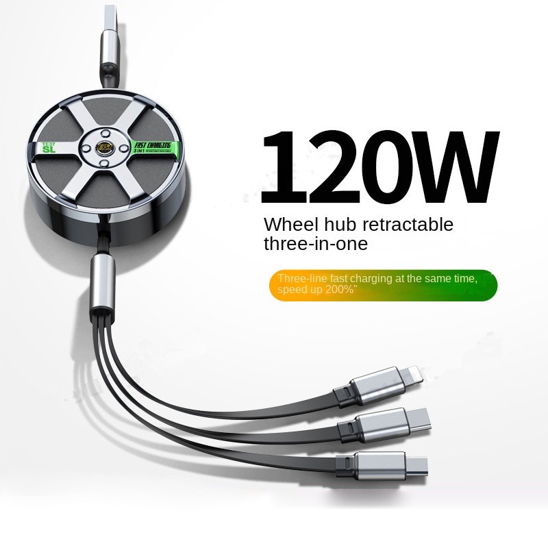 120W 3 in 1 Telescopic Super Fast Charging Cable For USB Type C Micro Wheel Hub Expansion Data Cable USB 6A Charging Cord