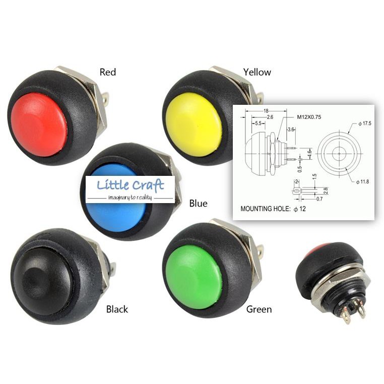 12mm Push On Button - Red, Yellow, Green, Black, Blue