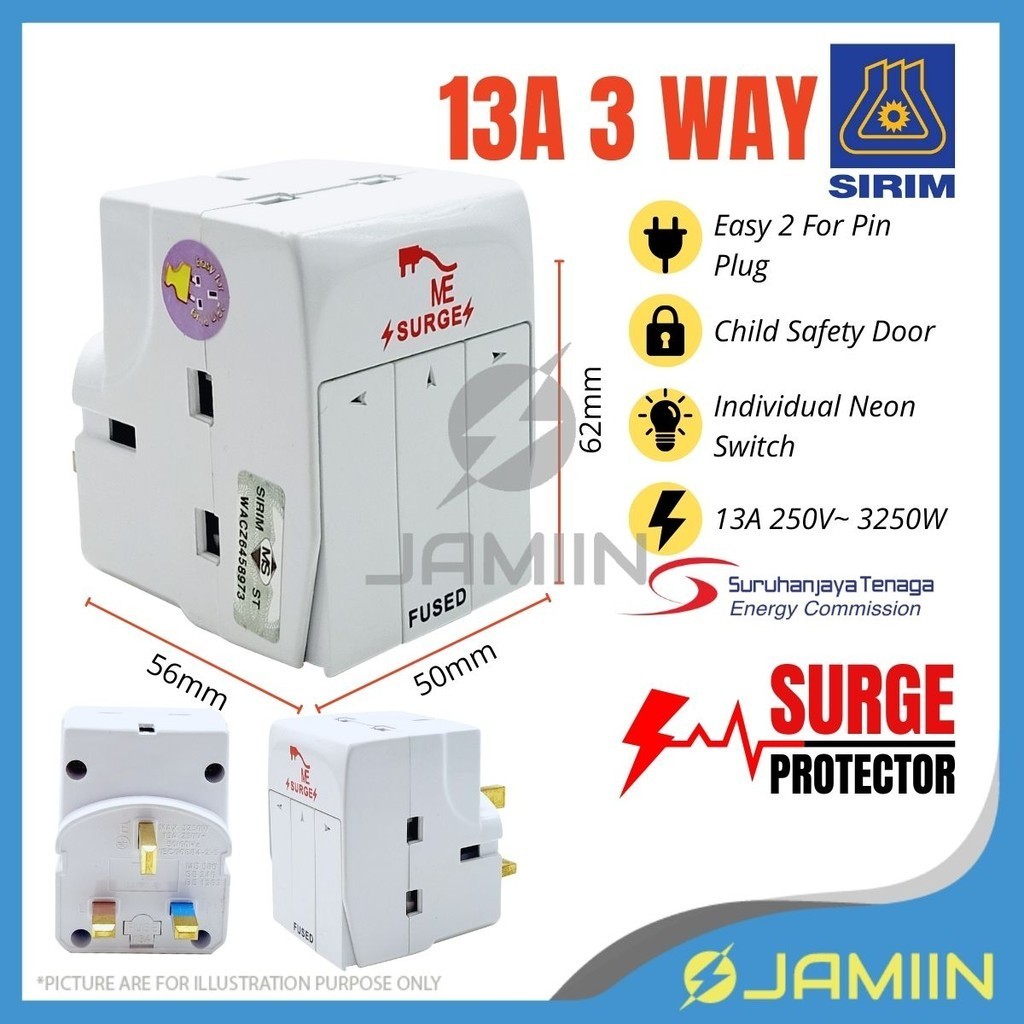 13A 3WAY Adaptor CW Individual Switch & Neon Safety Shutter 13A Easy for 2 Pin Plug Extension Plug Kepala Socket Plug