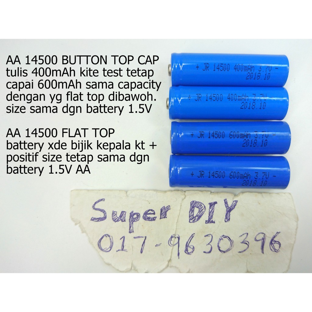 14500 AA size 3.7V 4.2V 600mAh rechargeable lithium ion Li-ion flat top battery sony flashlight torchlight lamp DIY
