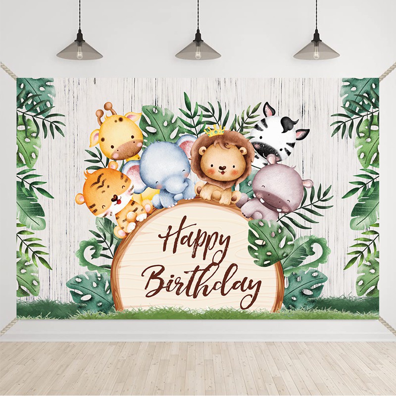 150x100CM Jungle Animal Happy Birthday Backdrop Safari Theme Party Decorations Kids Baby Shower Party Supplies Wild One Lion Green Forest Backdrop Photography Background