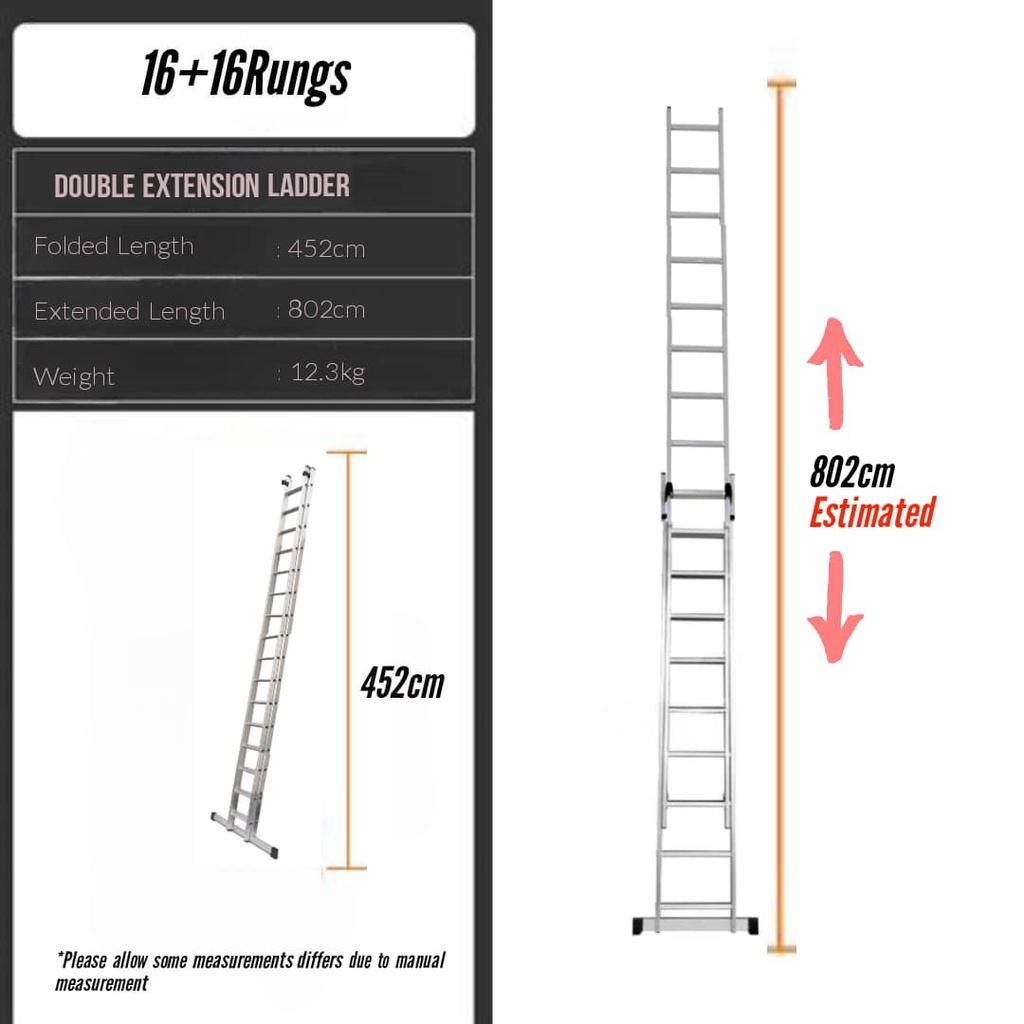 16 Feet 32 Steps Double Extension Telescopic Ladder Heavy Duty Foldable Aluminium Ladder 2Section 4.5m