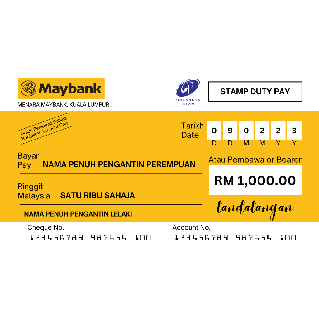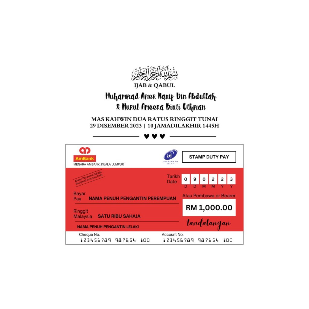 18 template cheque mockup bank perkahwinan pengantin lelaki perempuan cek akaun bank edit dlm canva saiz 175x96mm