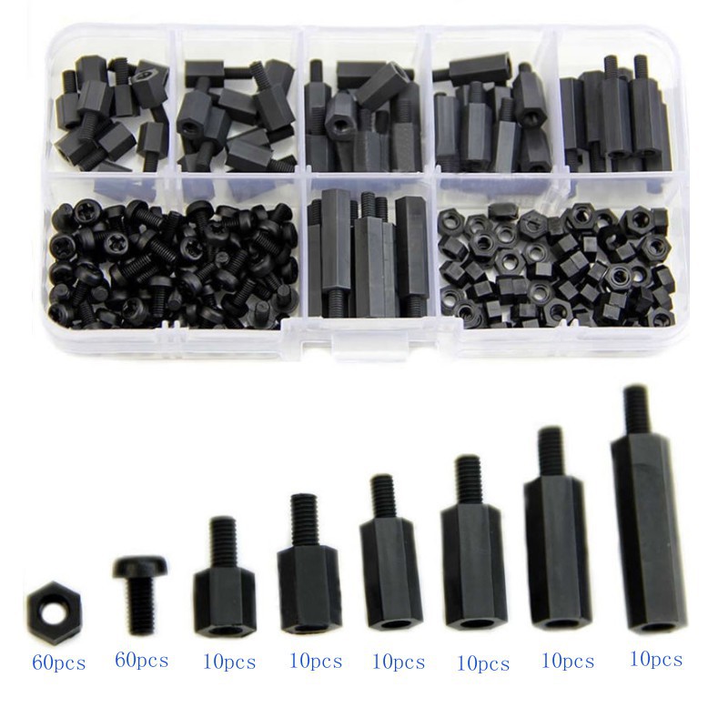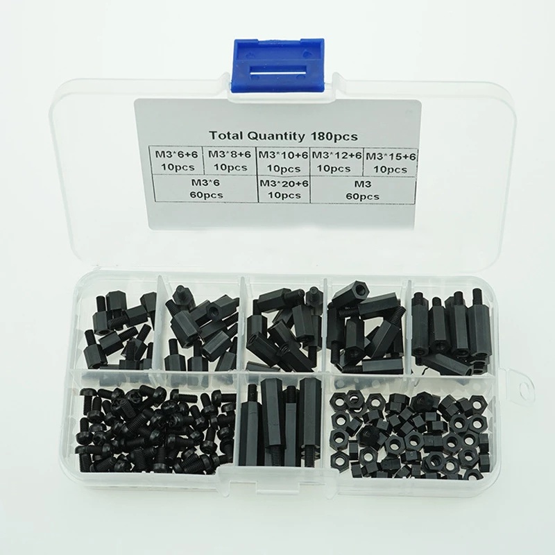 180pcs/Box M3 6-20mm Nylon Screw Hex Screw Nut PCB standoffs Assortment Kit with Box Fastener Hardware Black