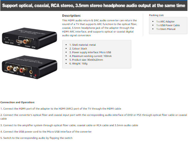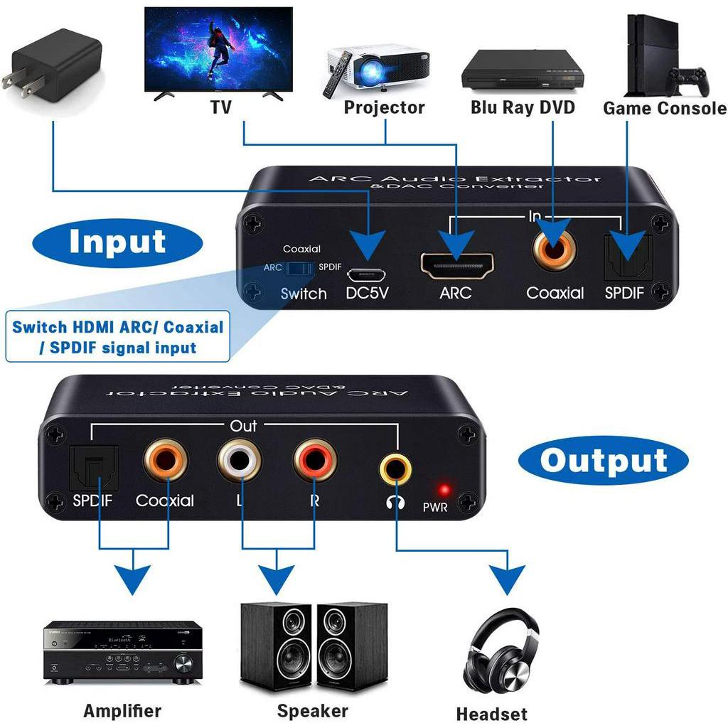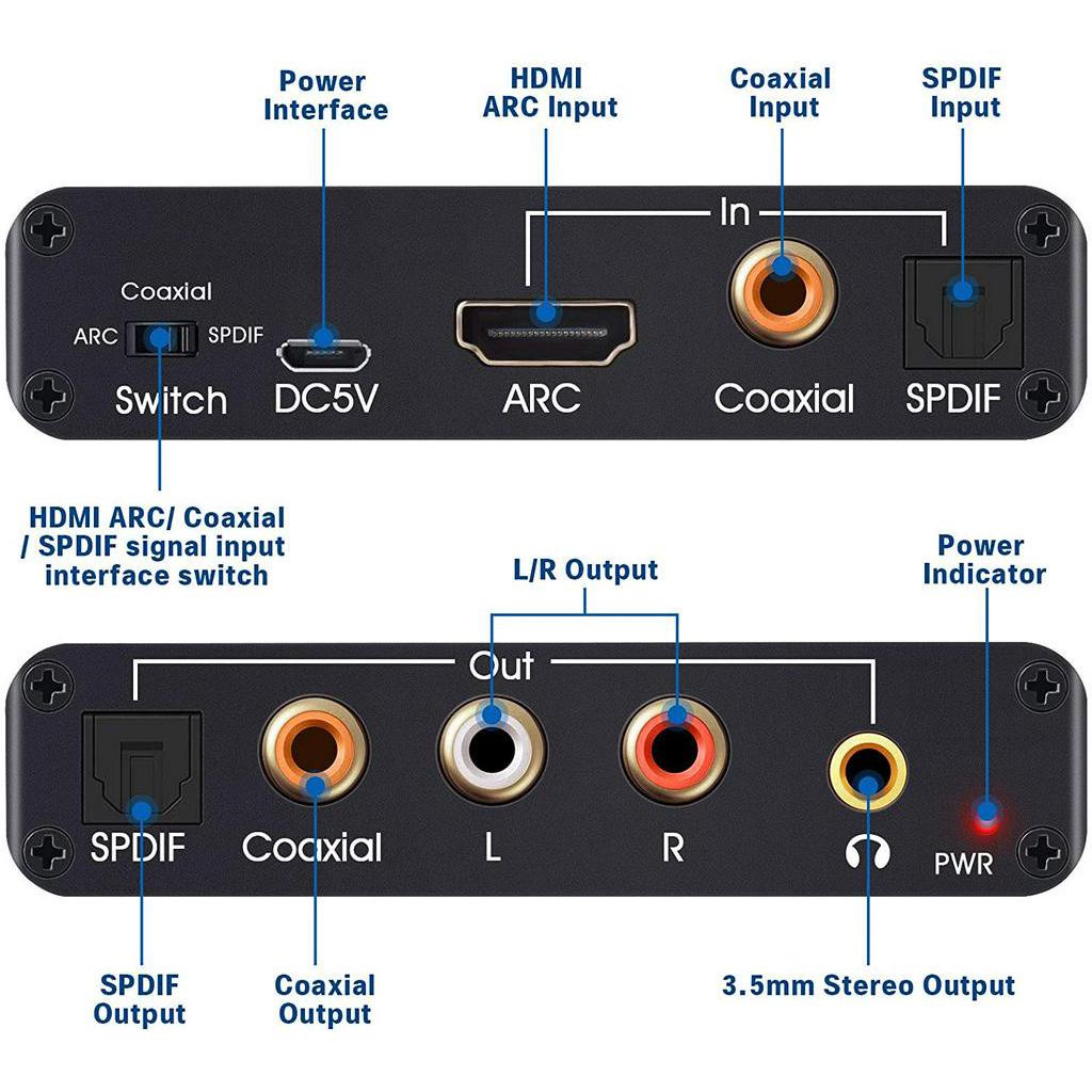 192KHz Aluminum ARC Audio Adapter HDMl Extractor Digital to Analog Audio Converter DAC SPDIF Coaxial RCA 3.5mm Output