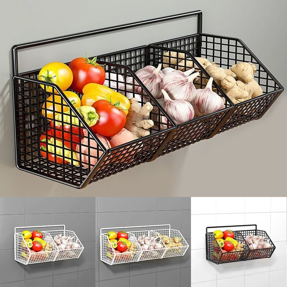 2/3 Grid Kitchen Food Wire Storage Basket Wall Mount Kitchen Storage Rack Onion Ginger Seasoning Basket Shelf