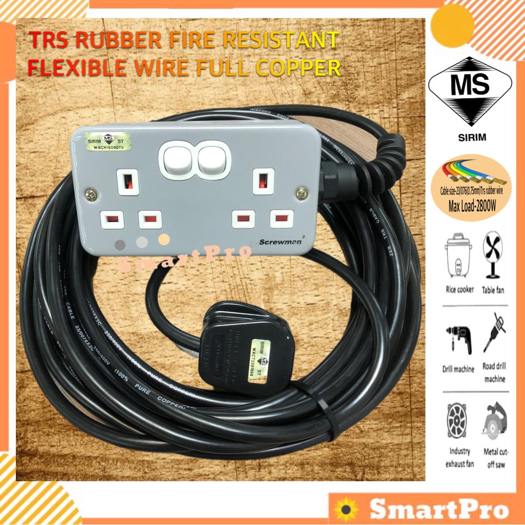 2 Gang Metal Clad Extension Heavy Duty Trailing Socket Extension 23/076 TRS Rubber Cable Full Copper Wire Max Load 2800w