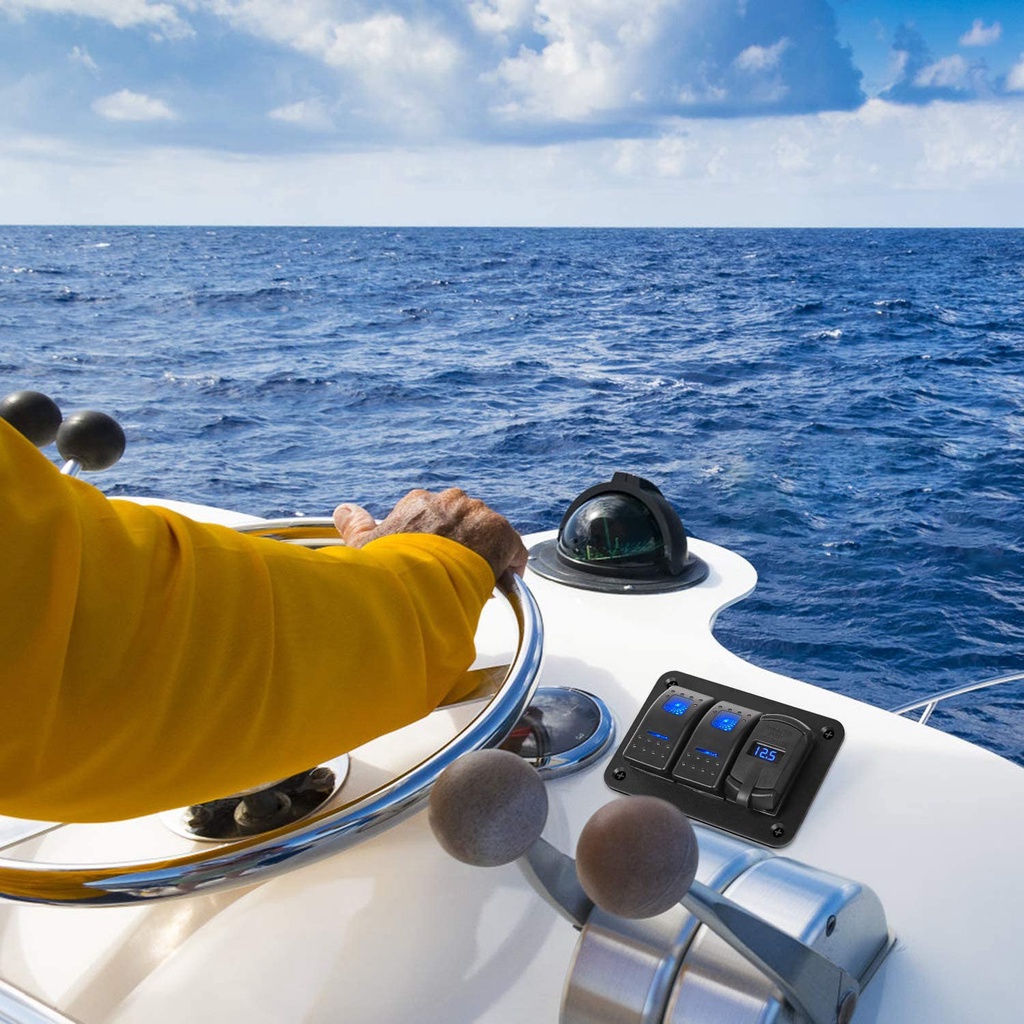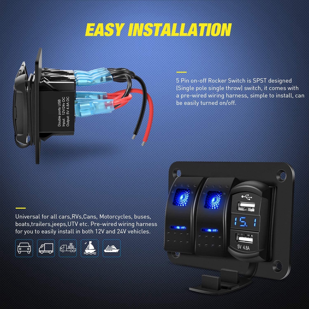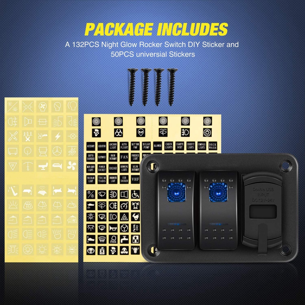 2 Gang Rocker Switch Panel with 4.8 Amp Dual USB Charger Voltmeter Waterproof 12V-24V DC Rocker Switch with Night Glow Stickers for CarsTrucks Boats RVs
