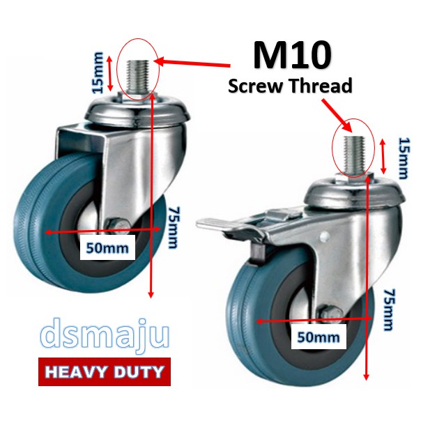 2 Inch M10 Screw Thread Heavy Duty Grey Rubber Wheel M10 Stem 10mm Screw Roller Caster Grey Roller Castor Trolley Roda