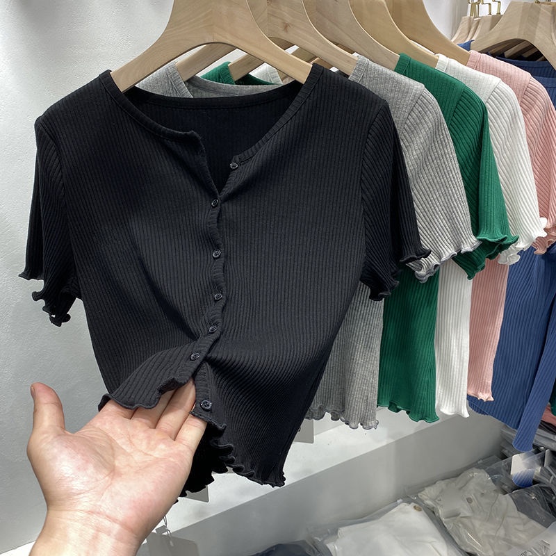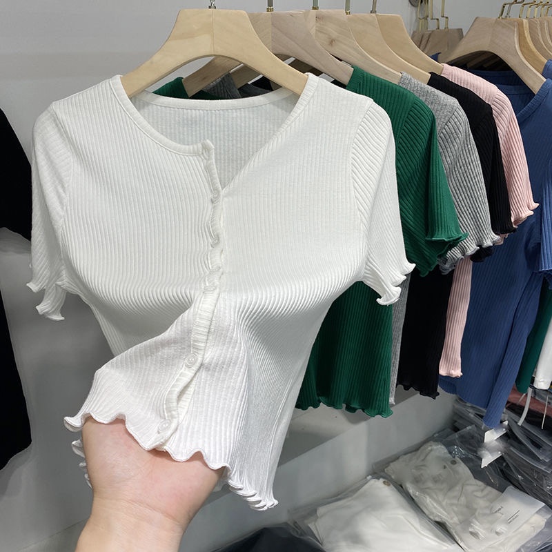 Summer women agaric edge cardigan T-shirt slim short sleeve solid color