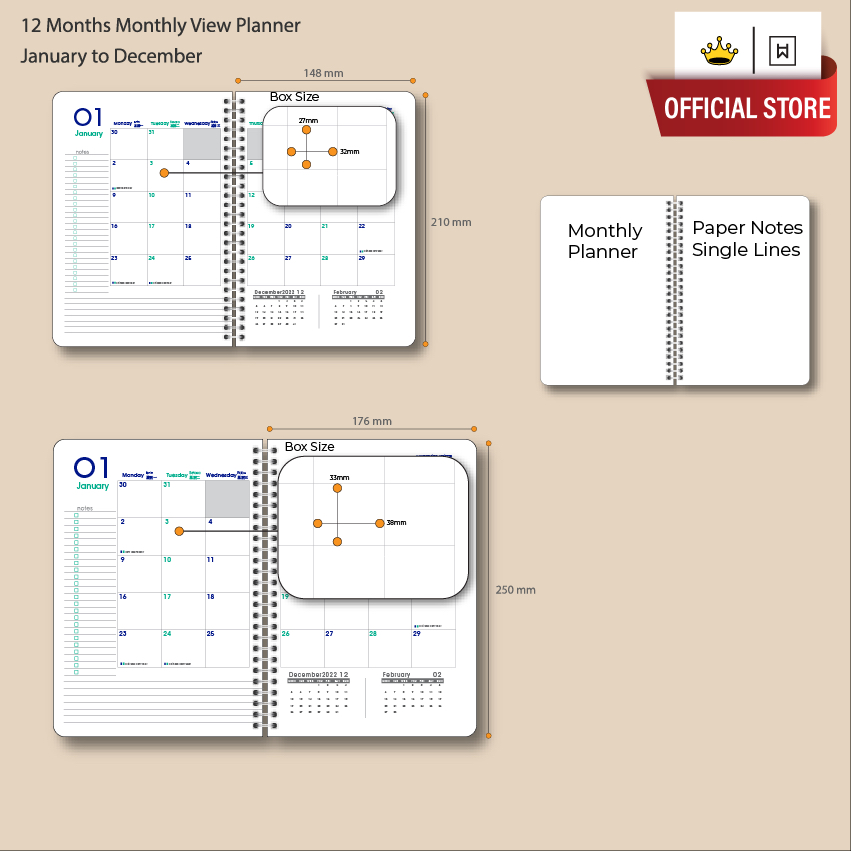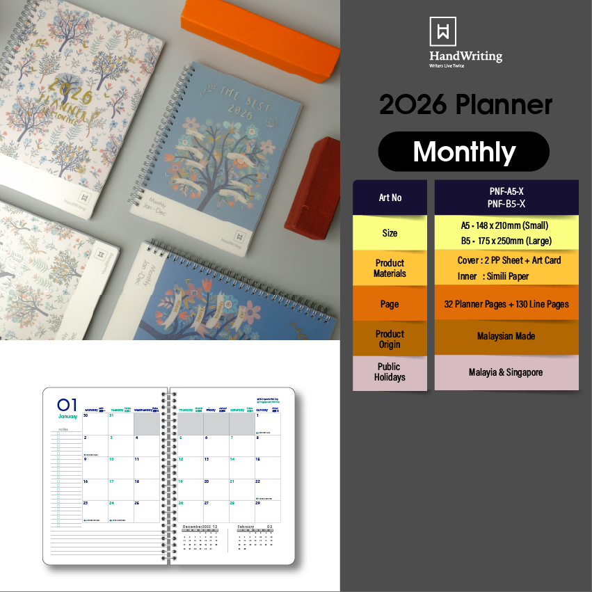 Handwriting 2026 Monthly Planner Notebook with Single Line Pages PNF-A5-X | PNF-B5-X