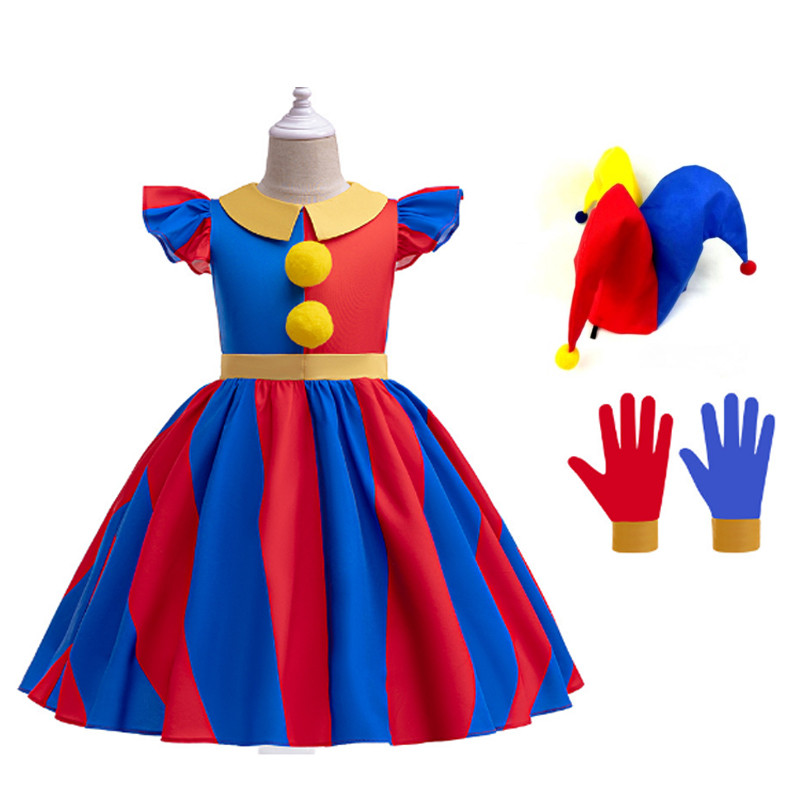 Anime The Amazing Digital Circus Pomni Costume for Kids Girl Cute Colorful Clown Dress Gloves Bag for Girls Clown Halloween Party Cosplay Terno