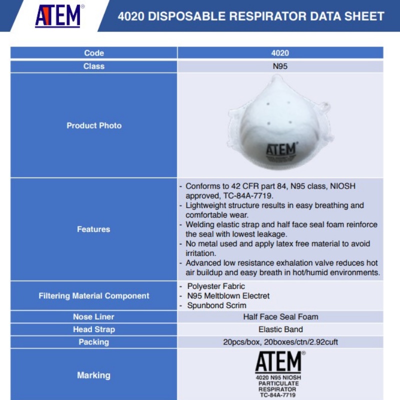 20Pcs/box ATEM N95 4020 Face Mask Molded with NIOSH Approved Pieces Wholesale Price