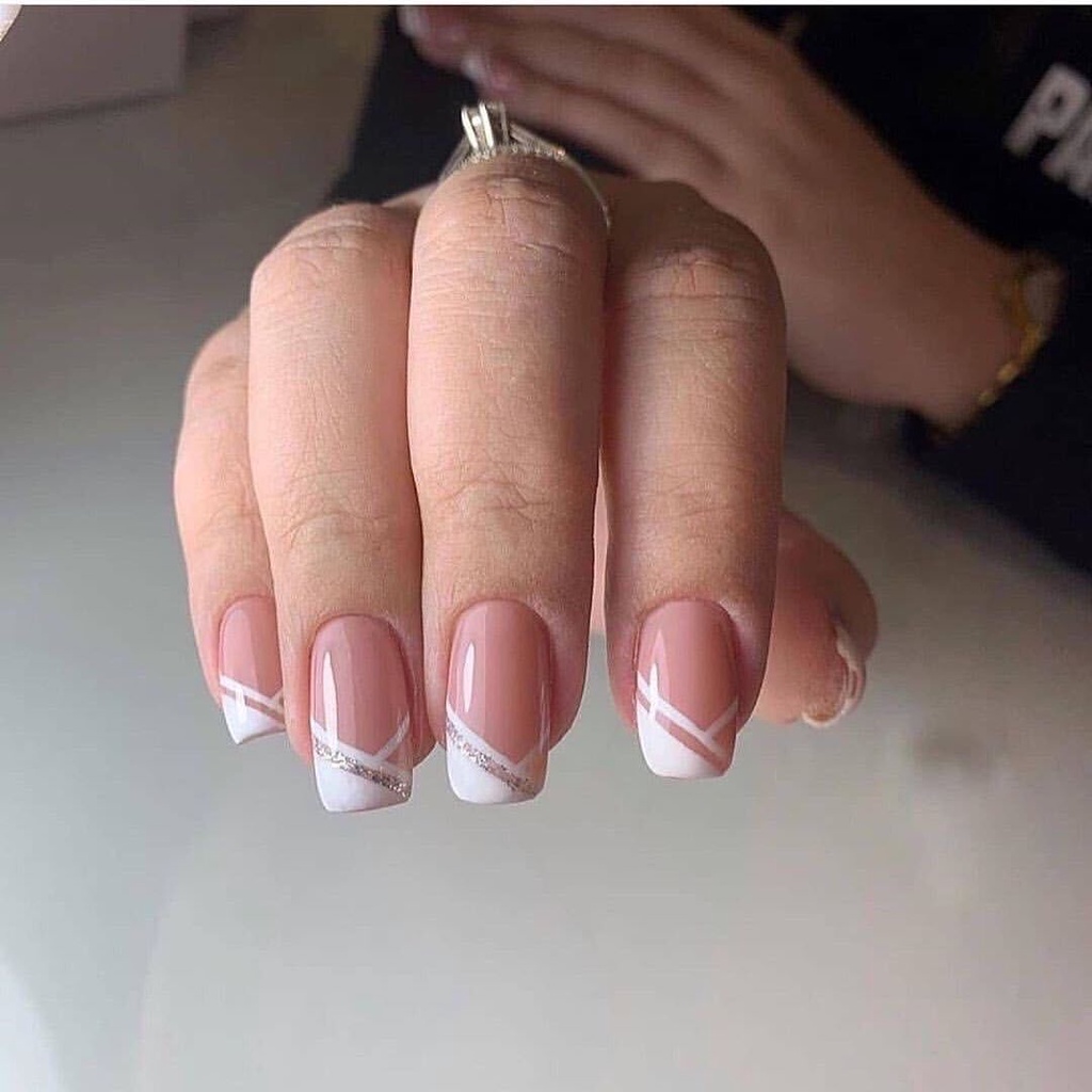 24pcs/box Oblique French Fake Nail Pink White Artificial False Nails Square Short Glossy Pattern Tips with Glue Sticker