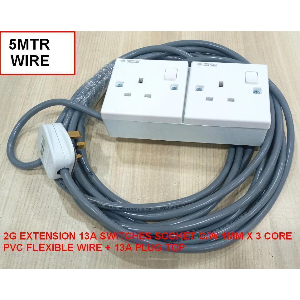 2G EXTENSION 13A SWITCHES SOCKET C/W 1MM X 3C PVC FLEX WIRE + 3PIN PLUG (1M/2M/3M/4M/5M/6M/7M/8M/9M/10M)