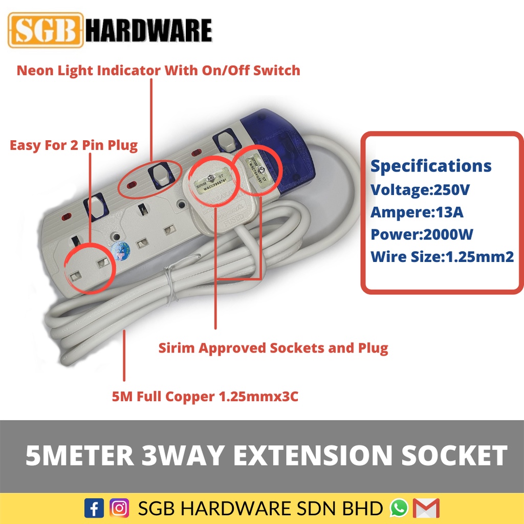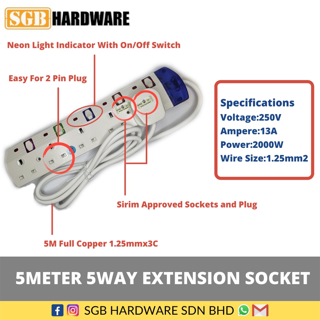 2M 5M Extension Socket Multiple Plug Adaptor Trailing w Neon Universal Adapter / 5&10Yard Extension Cable Box [Sirim] ~