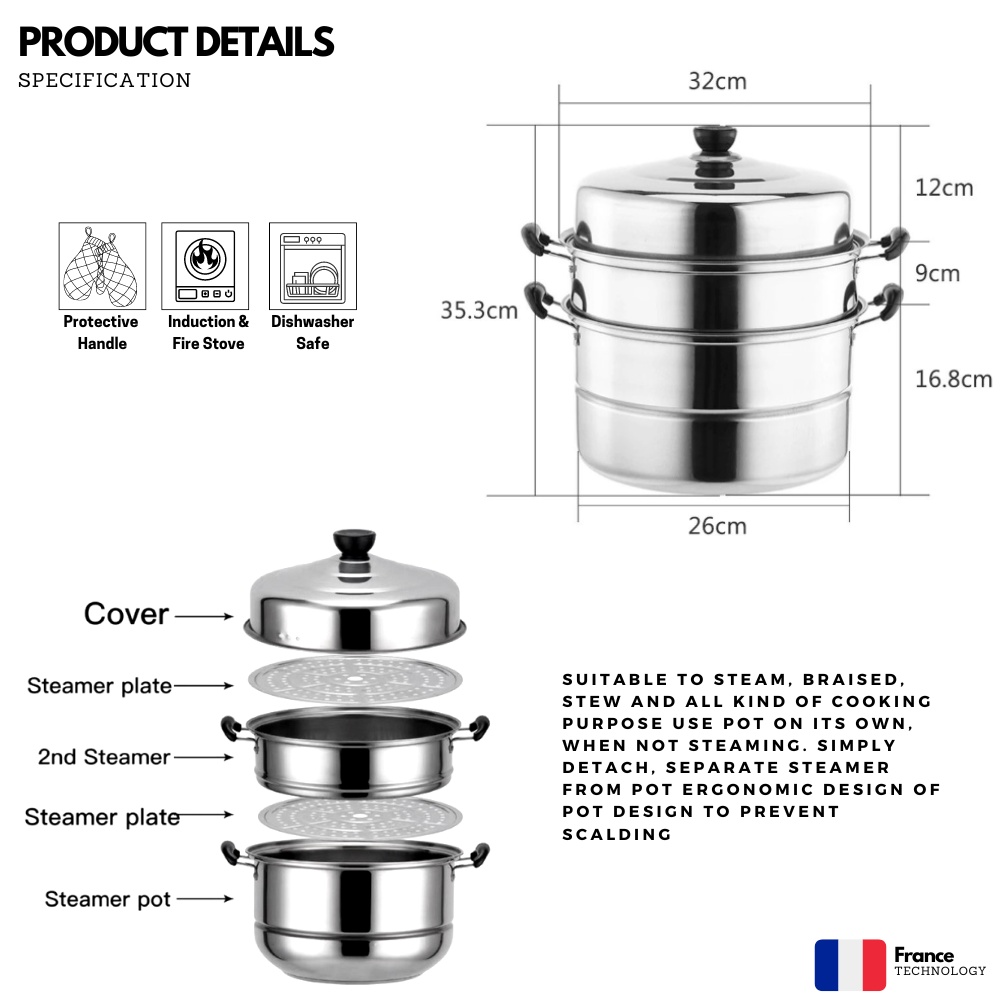 3 LAYER STAINLESS STEEL MULTIPURPOSE STEAMER POT 32/28 CM SOUP POT COOKING POT LAYERS COMPOUND STEEL / PERIUK PENGUKUS