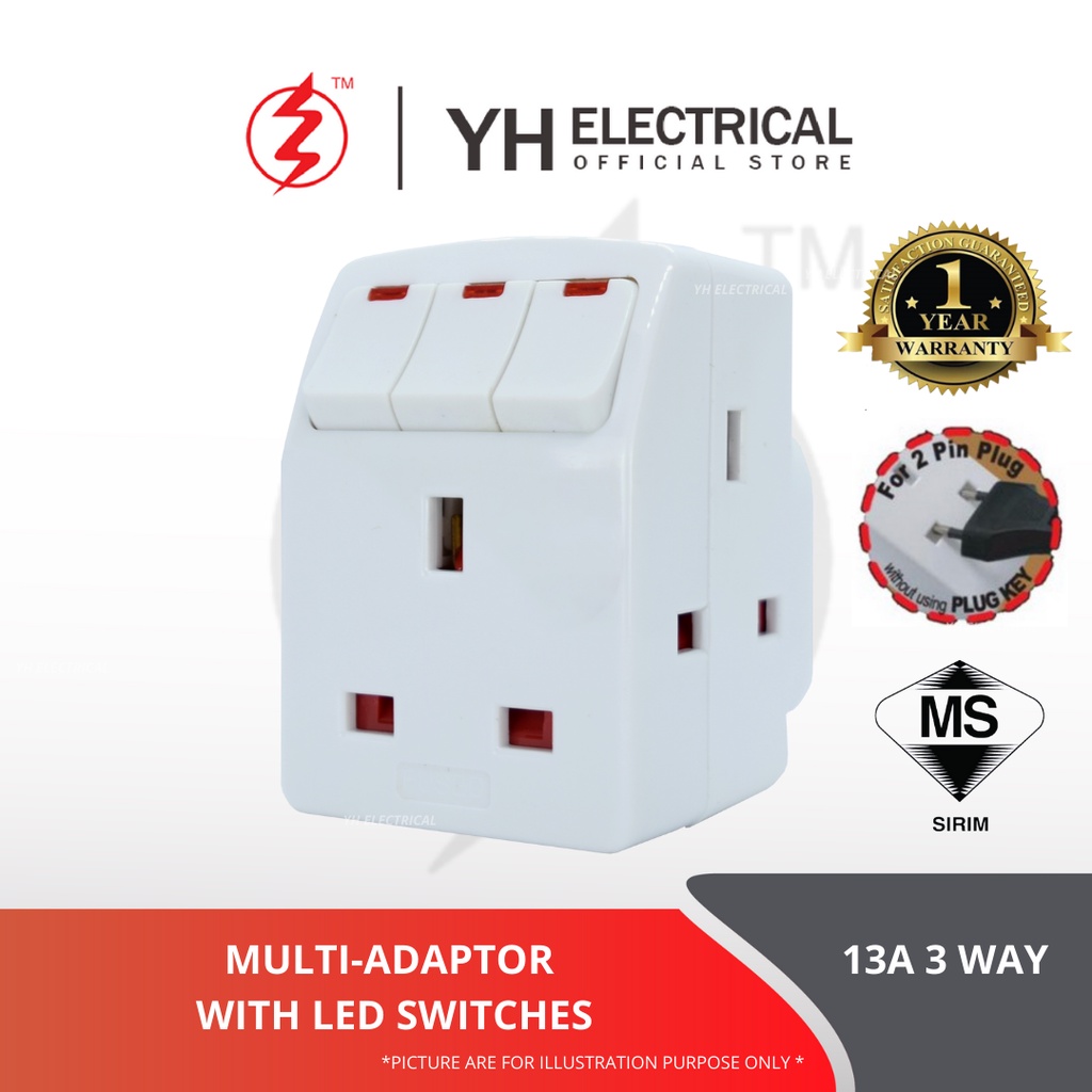 3 WAY ADAPTOR ADAPTER ADAPORT WITH SWITCH / SOCKET OUTLET PLUG EXTENSION WALL UNIVERSAL MULTI TRAVEL MULTIPLE SIRIM