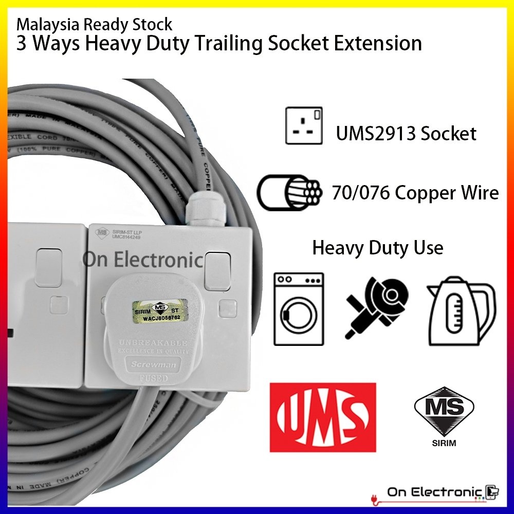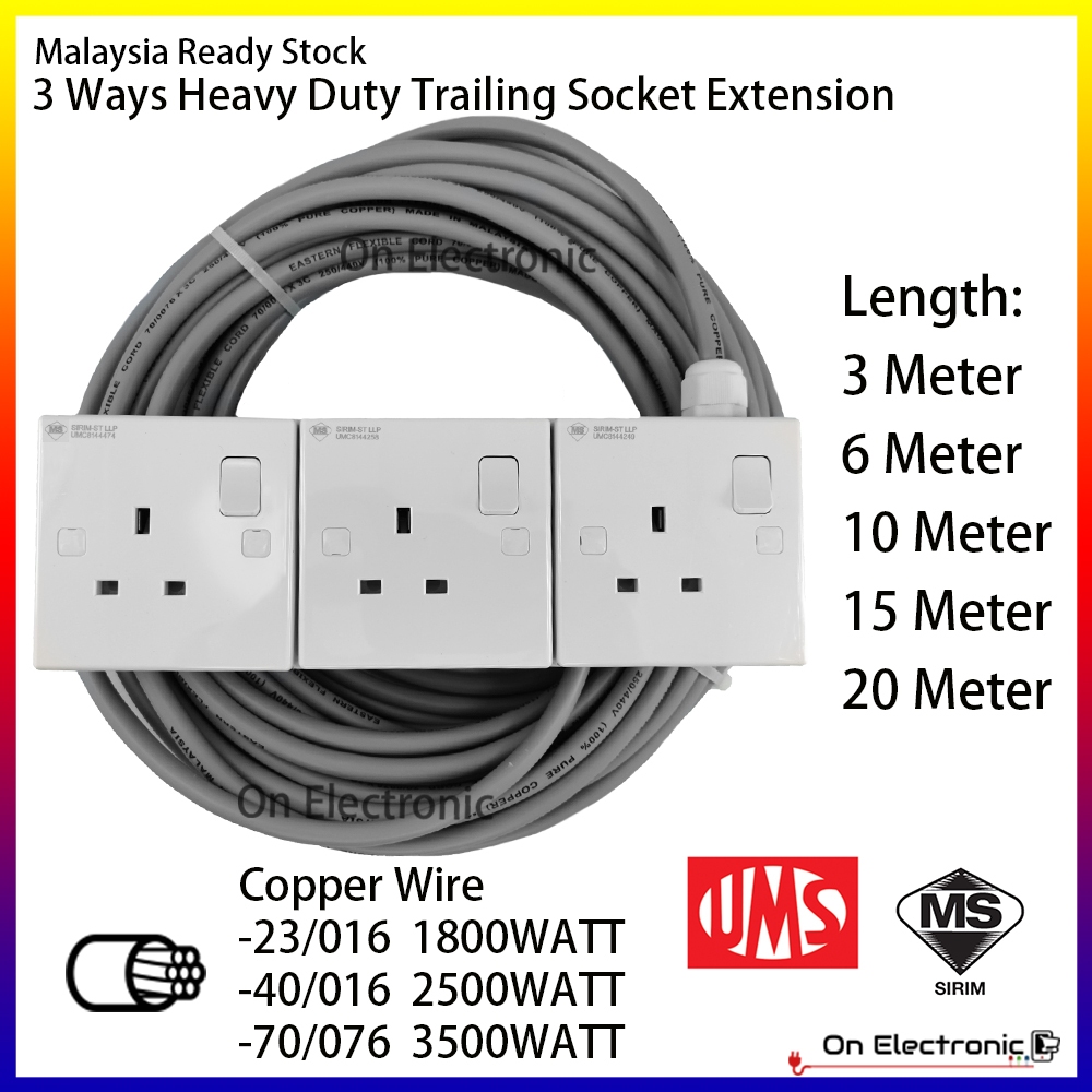 3 WAY HEAVY DUTY TRAILING SOCKET EXTENSION SOCKET 20 METER 70 / 076 x 3C Flexible Cable FULL COPPER WIRE