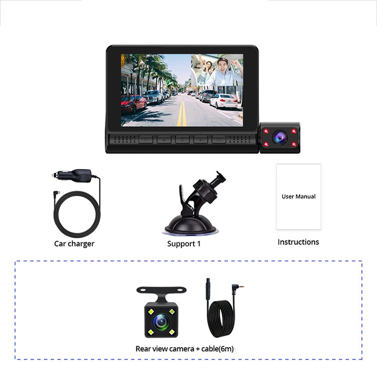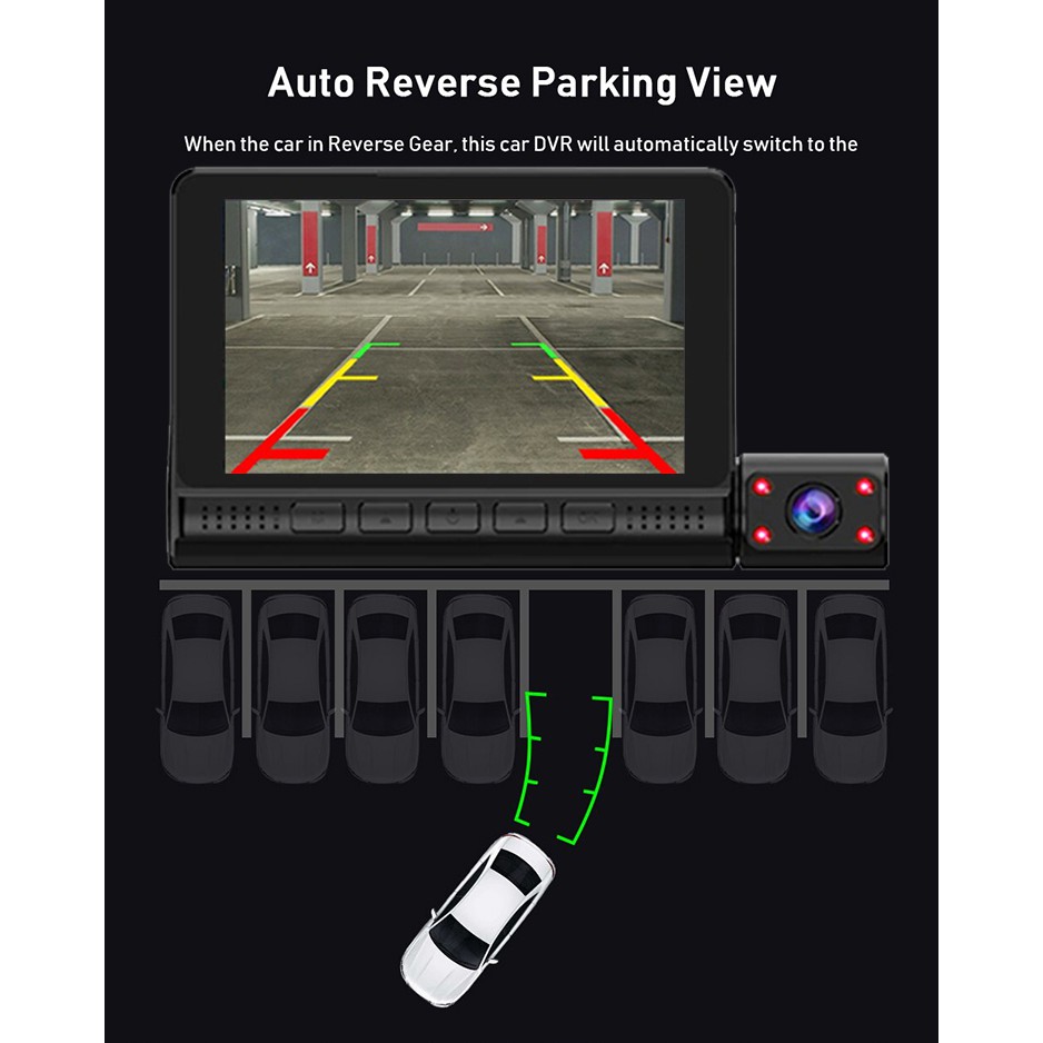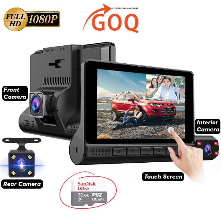 3-Way Car Camera Recorder (Front + Interior + Back) GOQ D909 3 Lens Dashcam Video Cam 1080P FHD Touch Screen