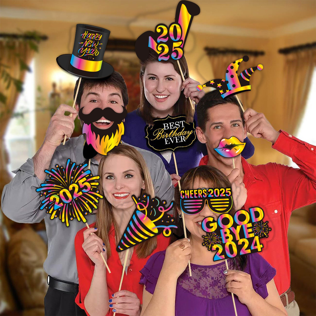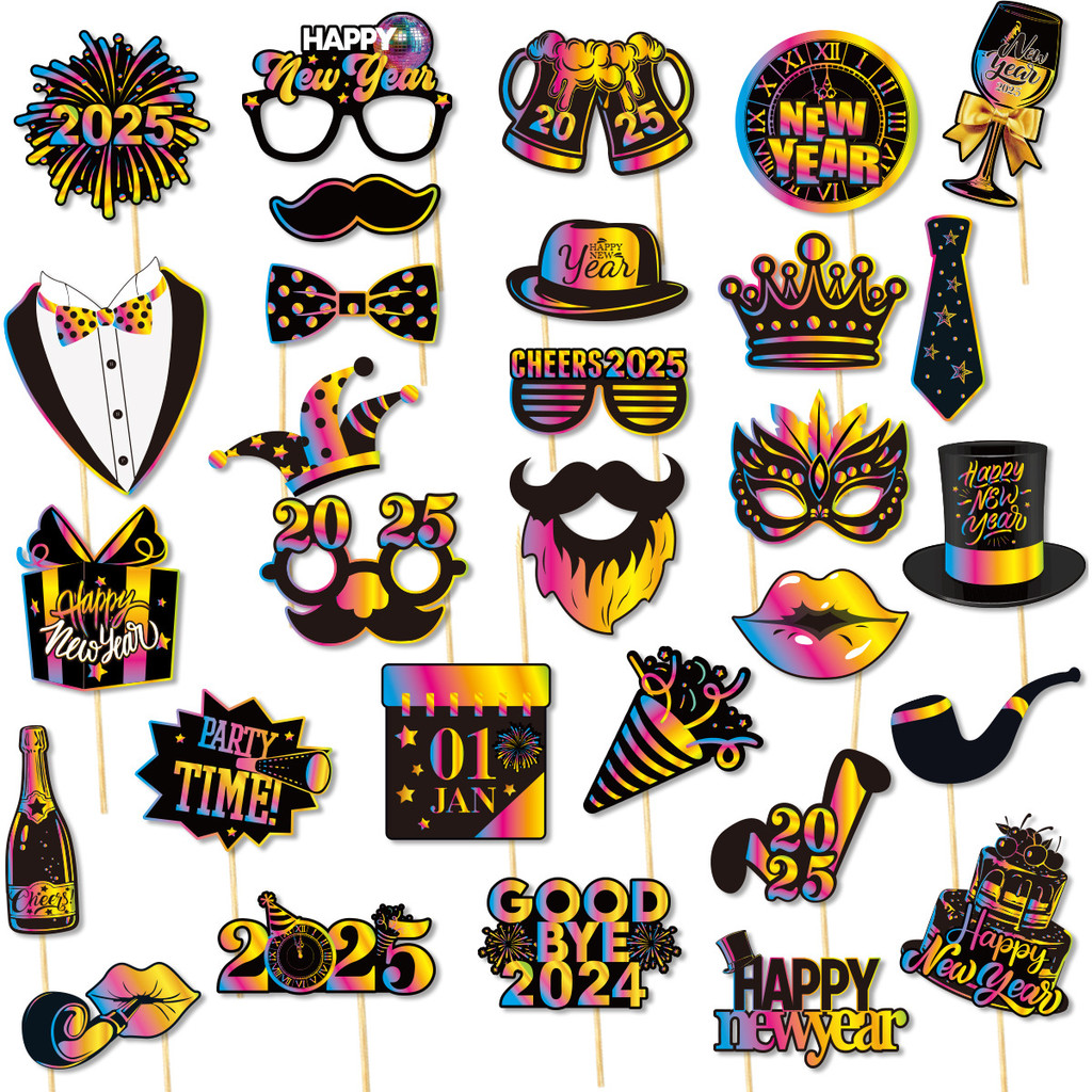 30 Pcs 2025 New Year Decorations Photo Booth Props Happy New Year Theme Party Photo Props 2025 Hoilday Supplies