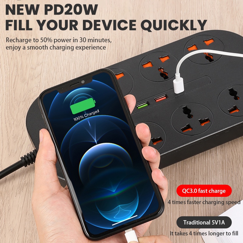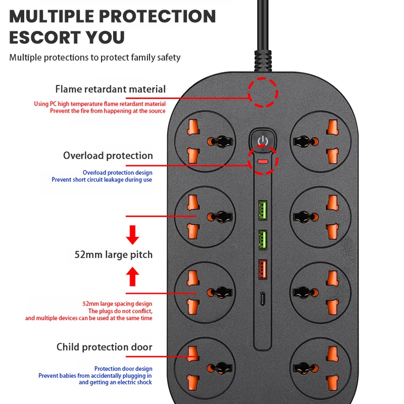 3000W British 3 pin universal outlet 3/8AC power socket extension plug with surge protector adapter USB port explanation