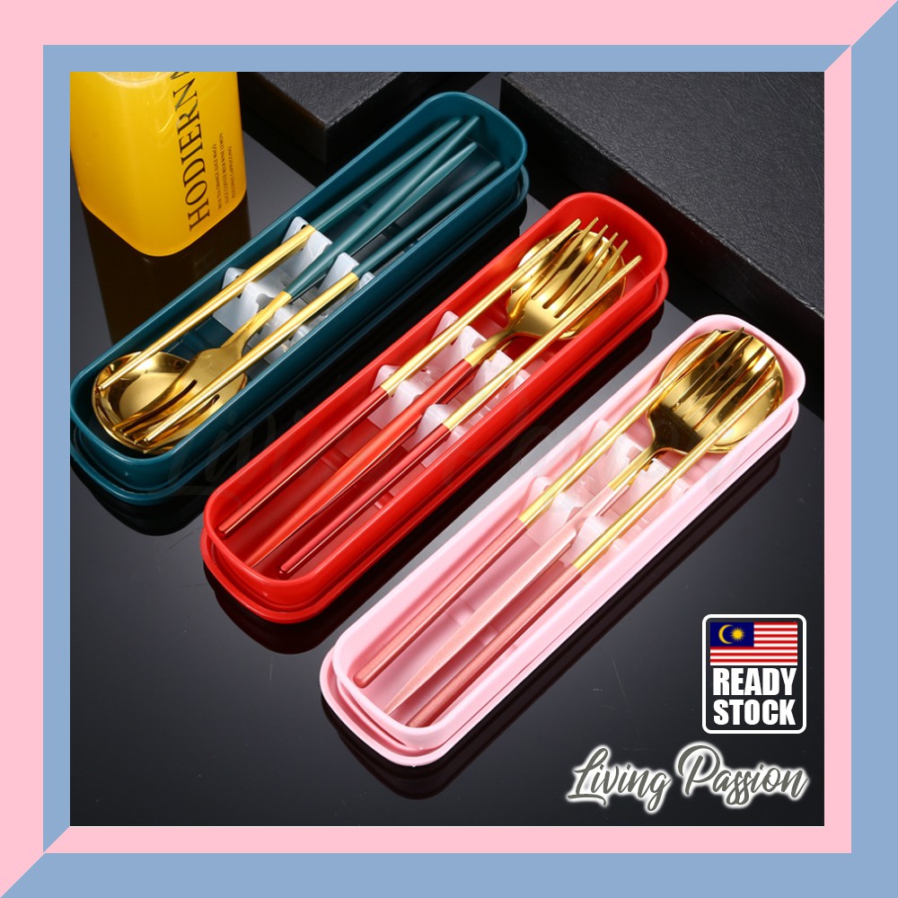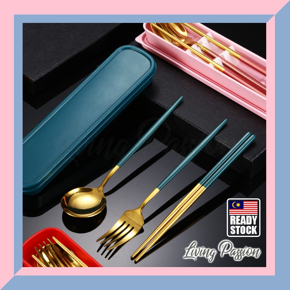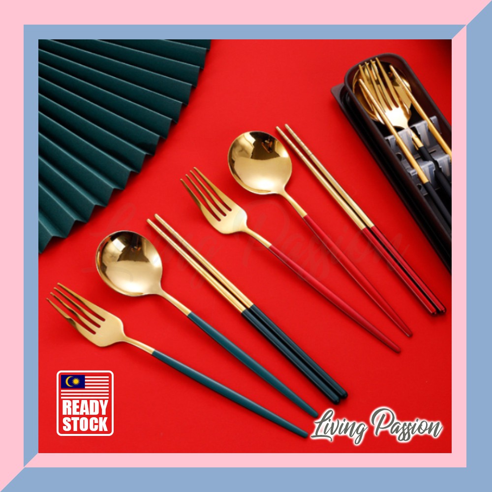 304 Stainless Steel Spoon Fork Set with Case Portable Tableware (5pcs-Chopstick,Fork,Spoon,Box,Holder) Garpu Sudu Set