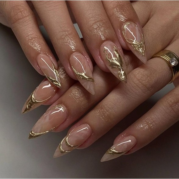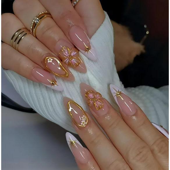 3D Almond Press on Nails with Glue Gold Stamping Medium Fake Nails Set False Nails