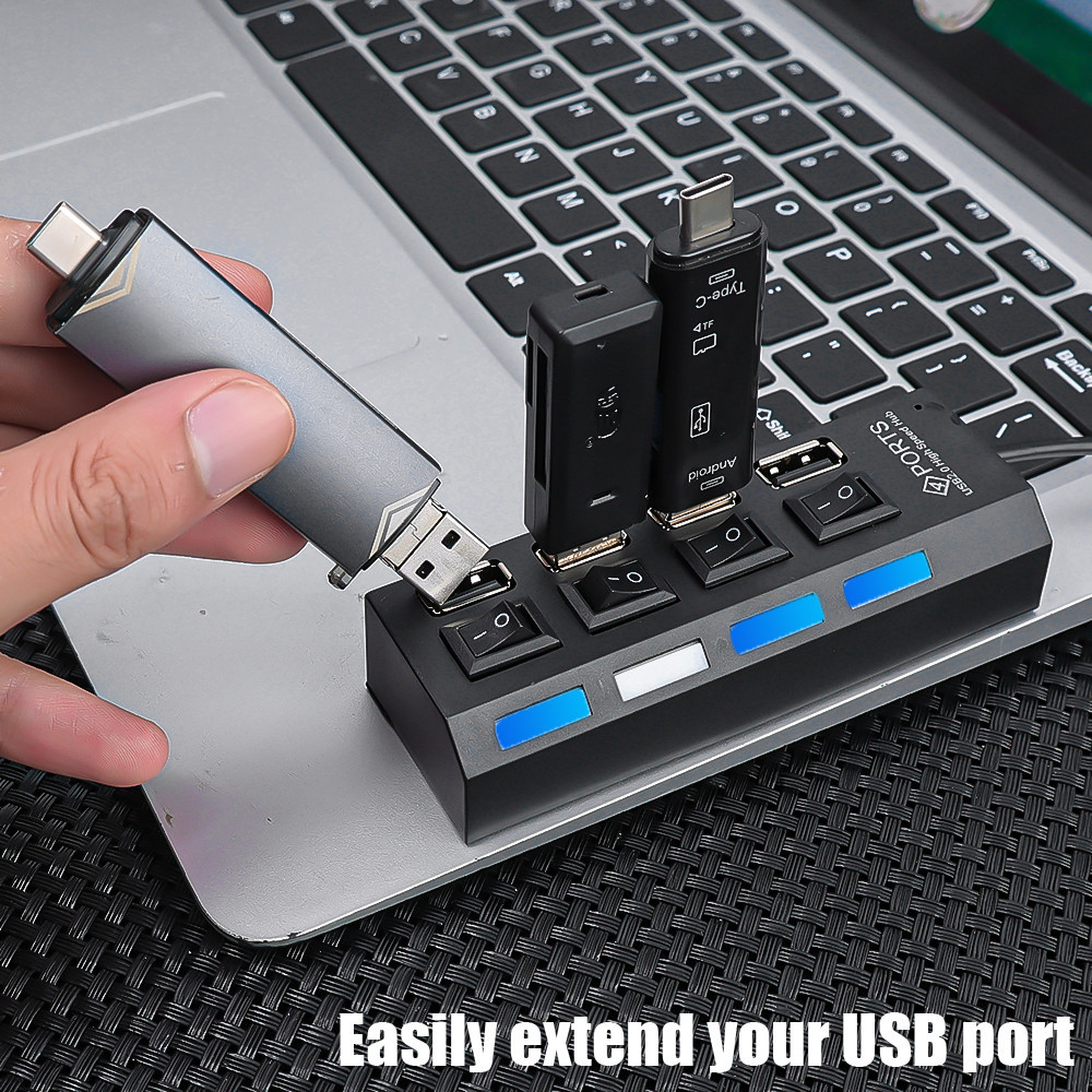 4 Ports Hub Splitter - Multi-Purpose Laptop U Disk Socket - USB 2.0 Expansion Interface - LED Light Independent Switch - For Mouse/Keyboard/USB Drive