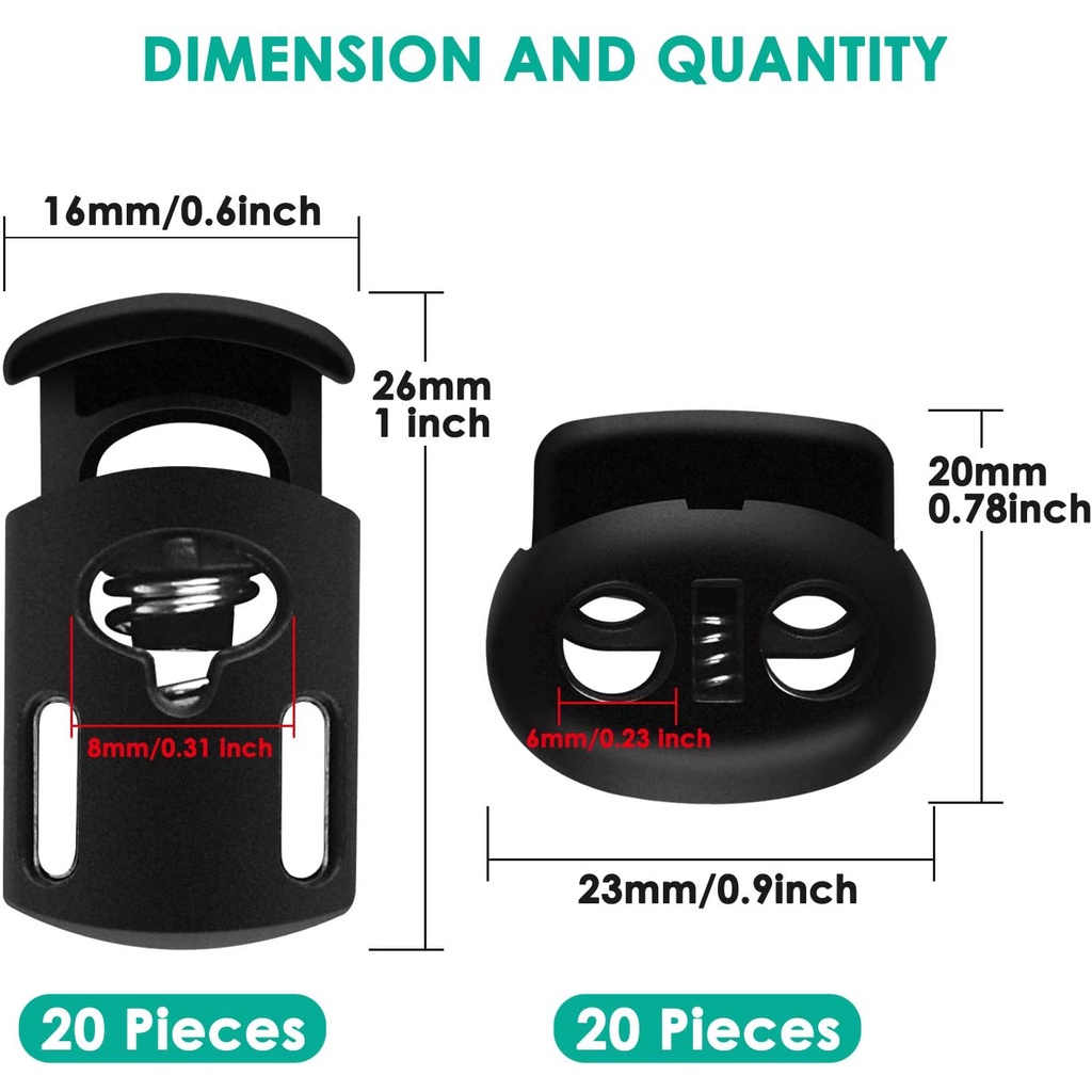 40 Pieces Plastic Cord Locks End Spring Stopper Fastener Slider End Spring Stop Toggle for Draw String Bags (20 Pieces Double-Hole, 20 Pieces Single-Hole, Black)