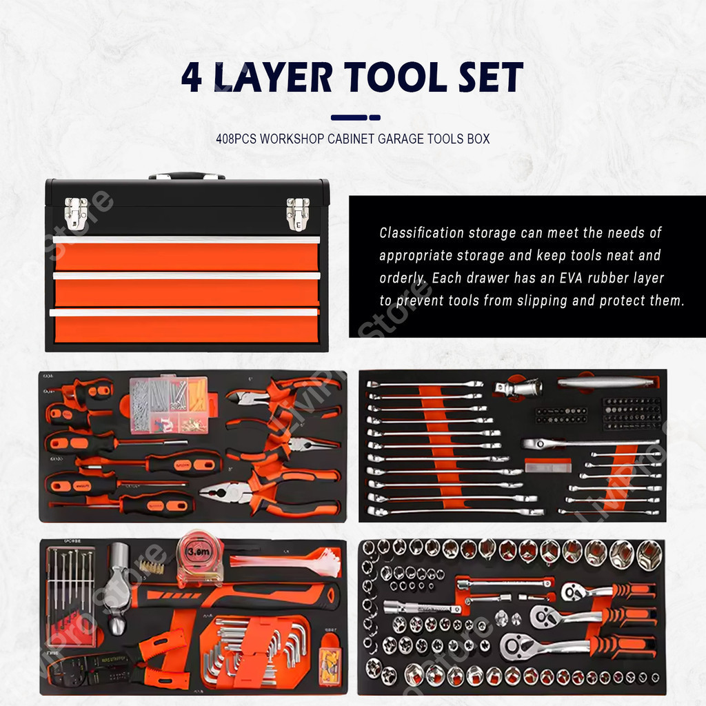 408pcs Metal Tool Box Set Socket Spanner Combination Heavy Duty Kotak Spannar Ratchet 4 Layer Ratchet Wrench Hand Tool