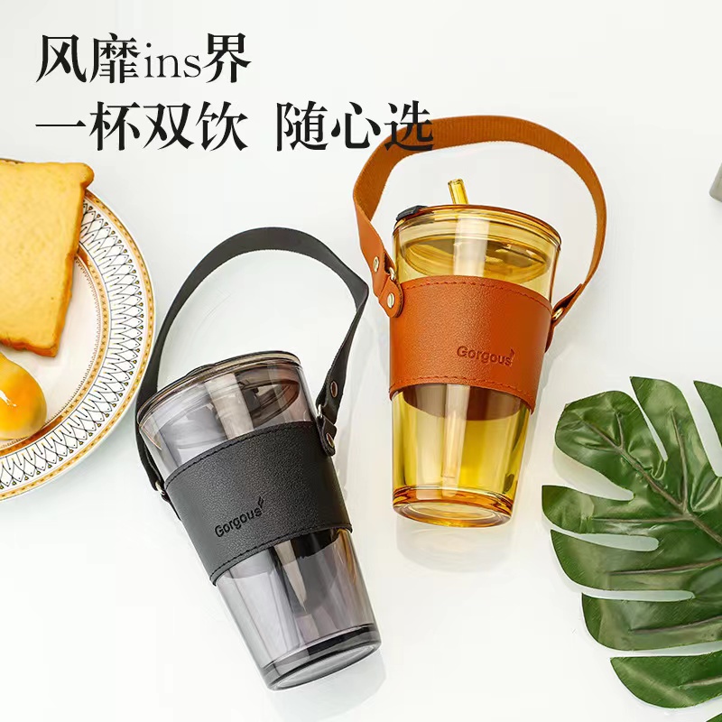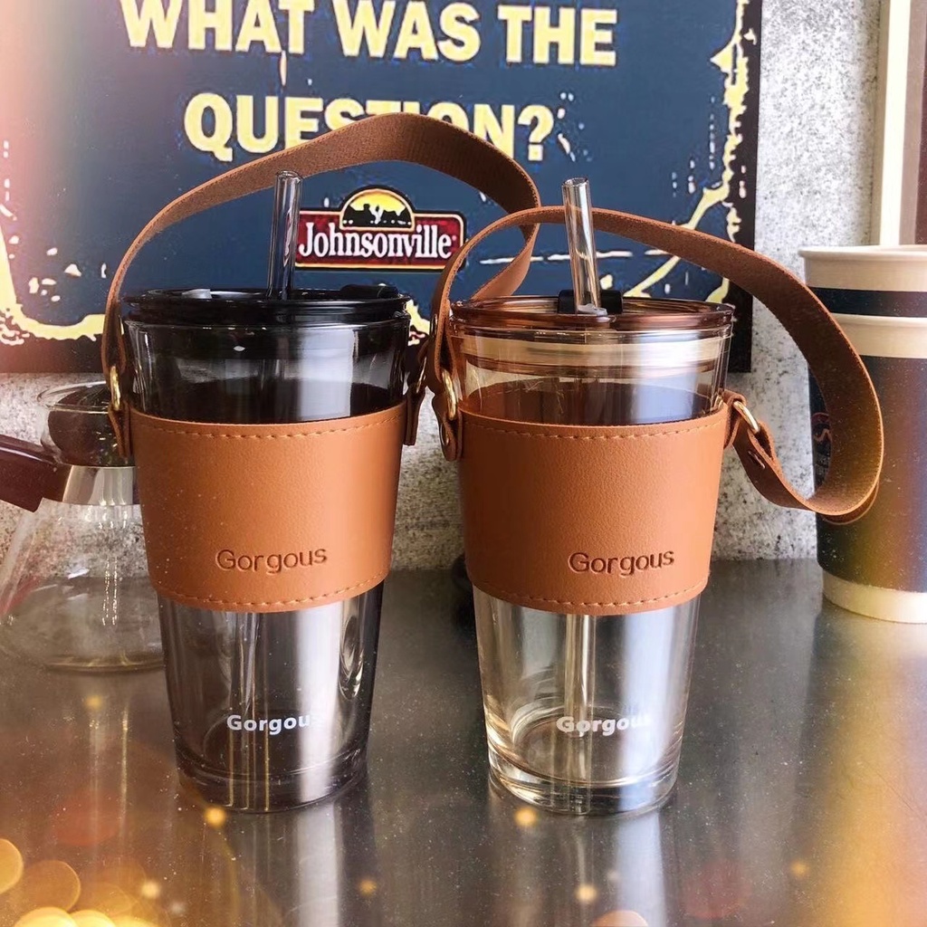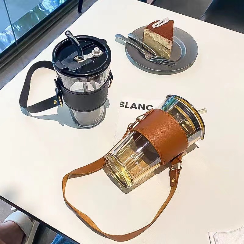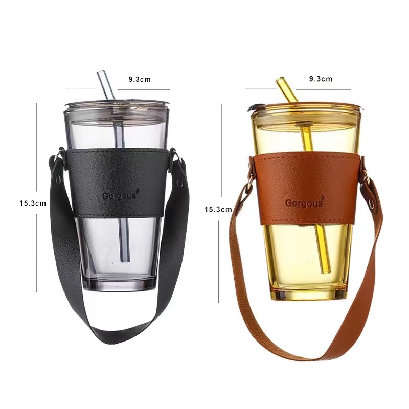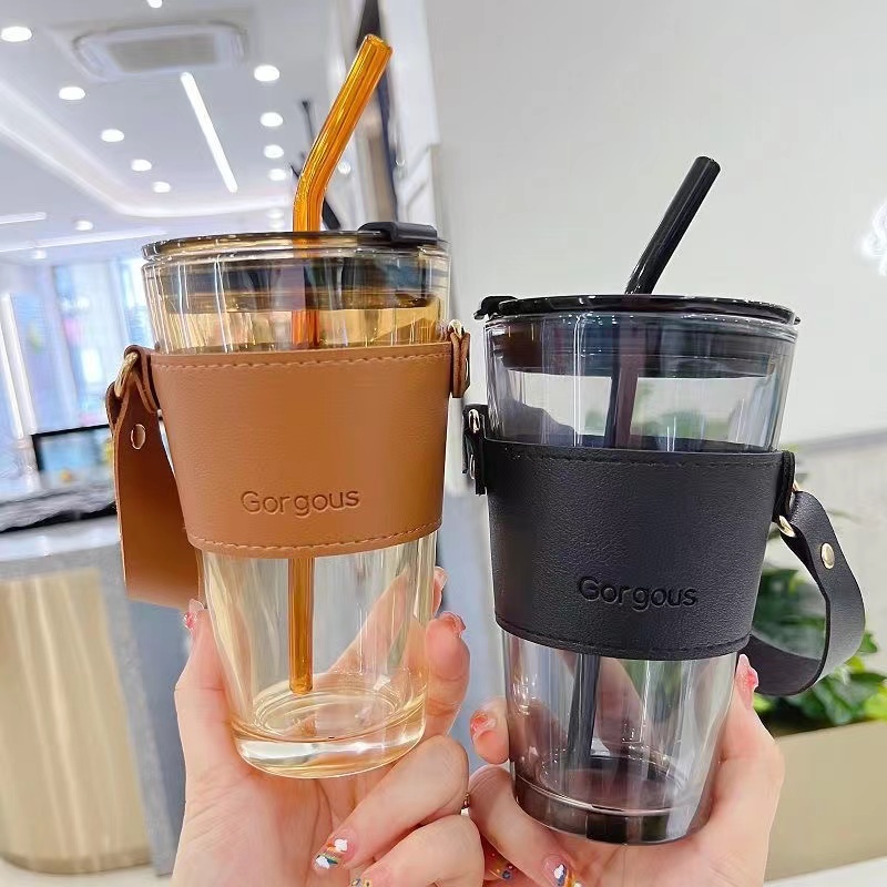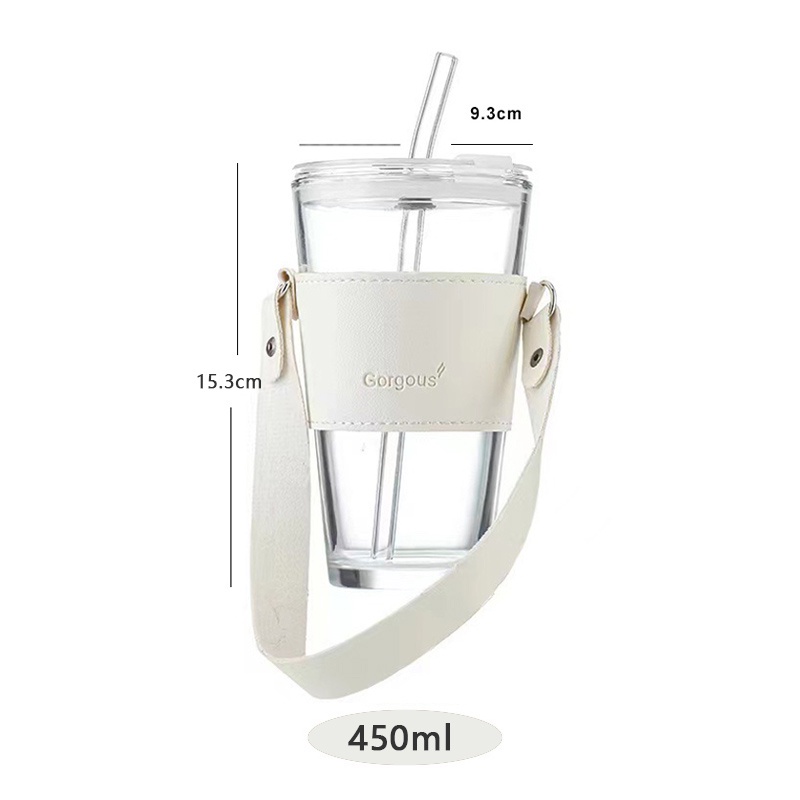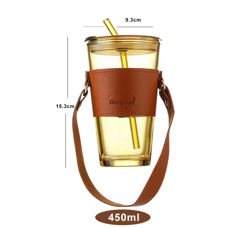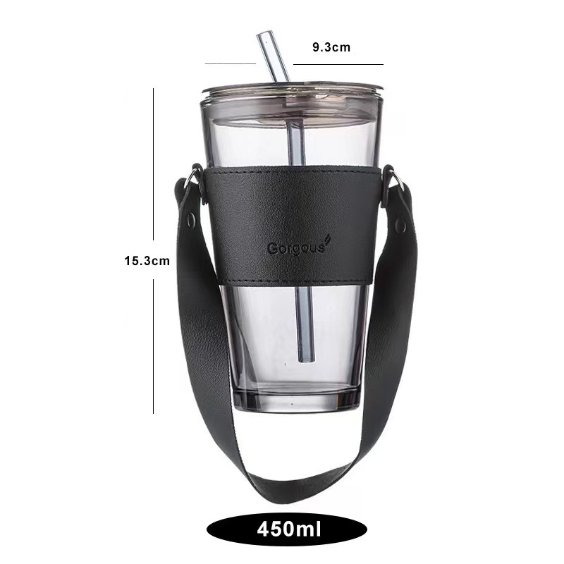 450ml glass straw cup cold-resistant and heat-resistant Glossy glass cup coffee cup with lid Portable Handle Anti-scalding Leather Case water milk tea cup Beverage Cup Fruit Jug