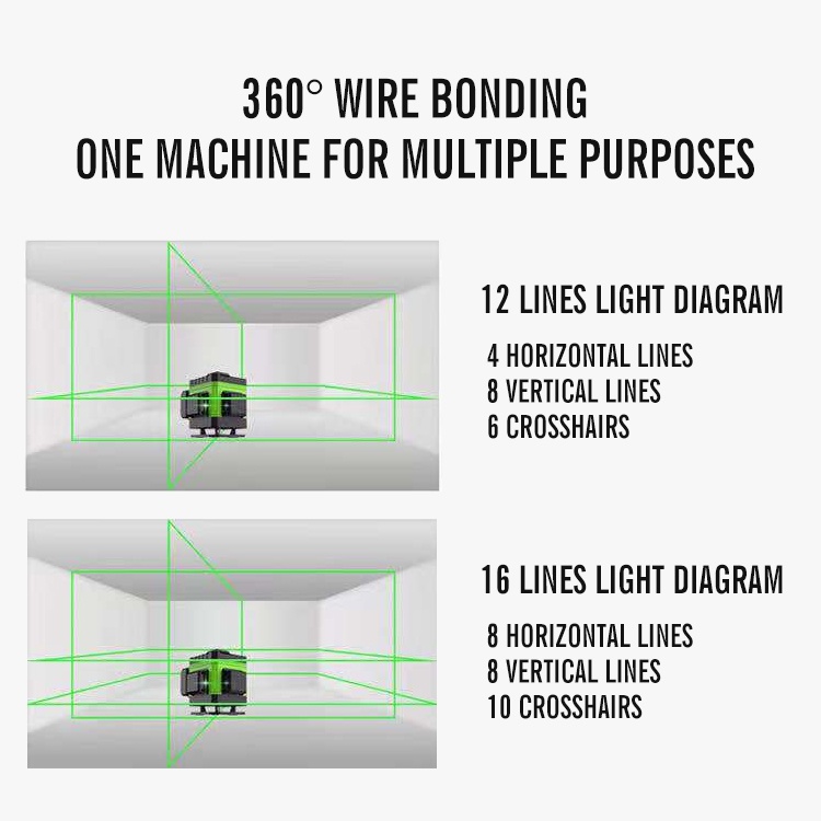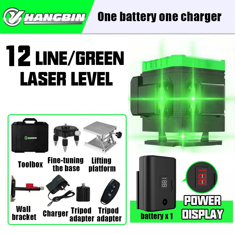 12/16 Line Laser Level Green Light Self-Leveling 360°Adjustable Rotary 3D 4D Auto Measuring Tool+3600mAh Battery
