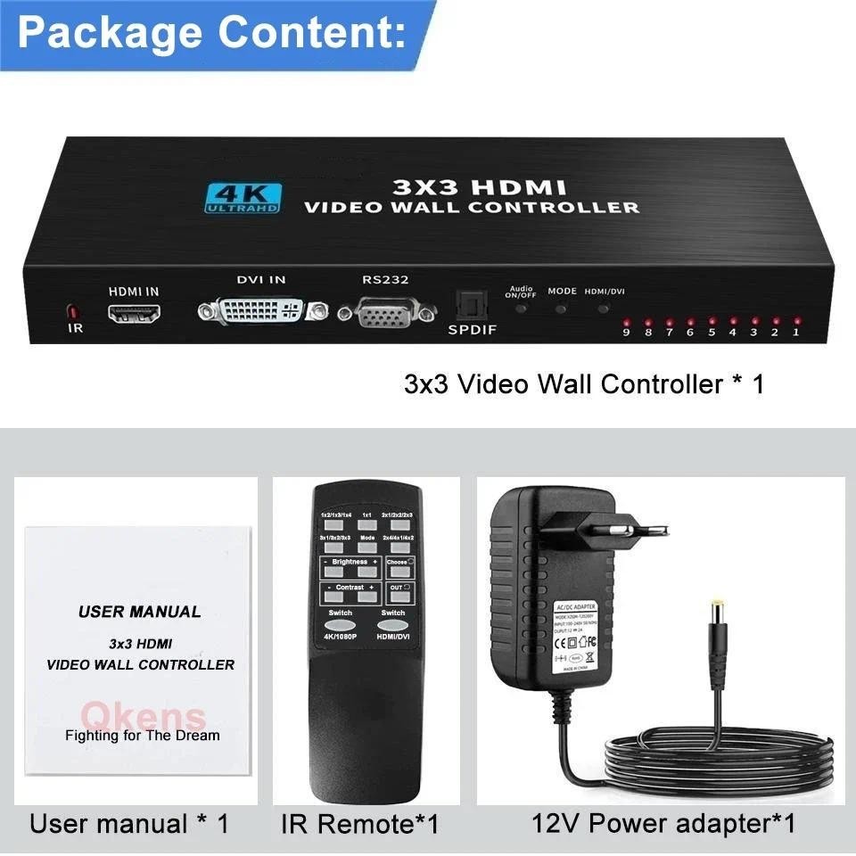 4K HD 1080P 3x3 HDMI DVI TV Splicer Video Wall Controller Processor 1X2 1X4 1X3 2X1 3X1 4X1 2x2 Multi Screen Processor Video Splicer Support 180 Degree Rotate in 2x2 Mode