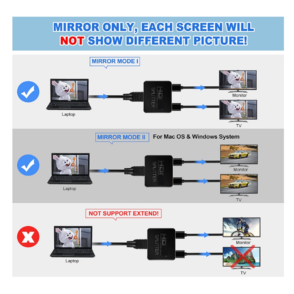 4K HDCP HDxl Splitter 1 in 2 Out for Dual Monitor Duplicate/Mirror Only 1 to 2 USB Power Full HD 1080P 3D TVbox Smart TV