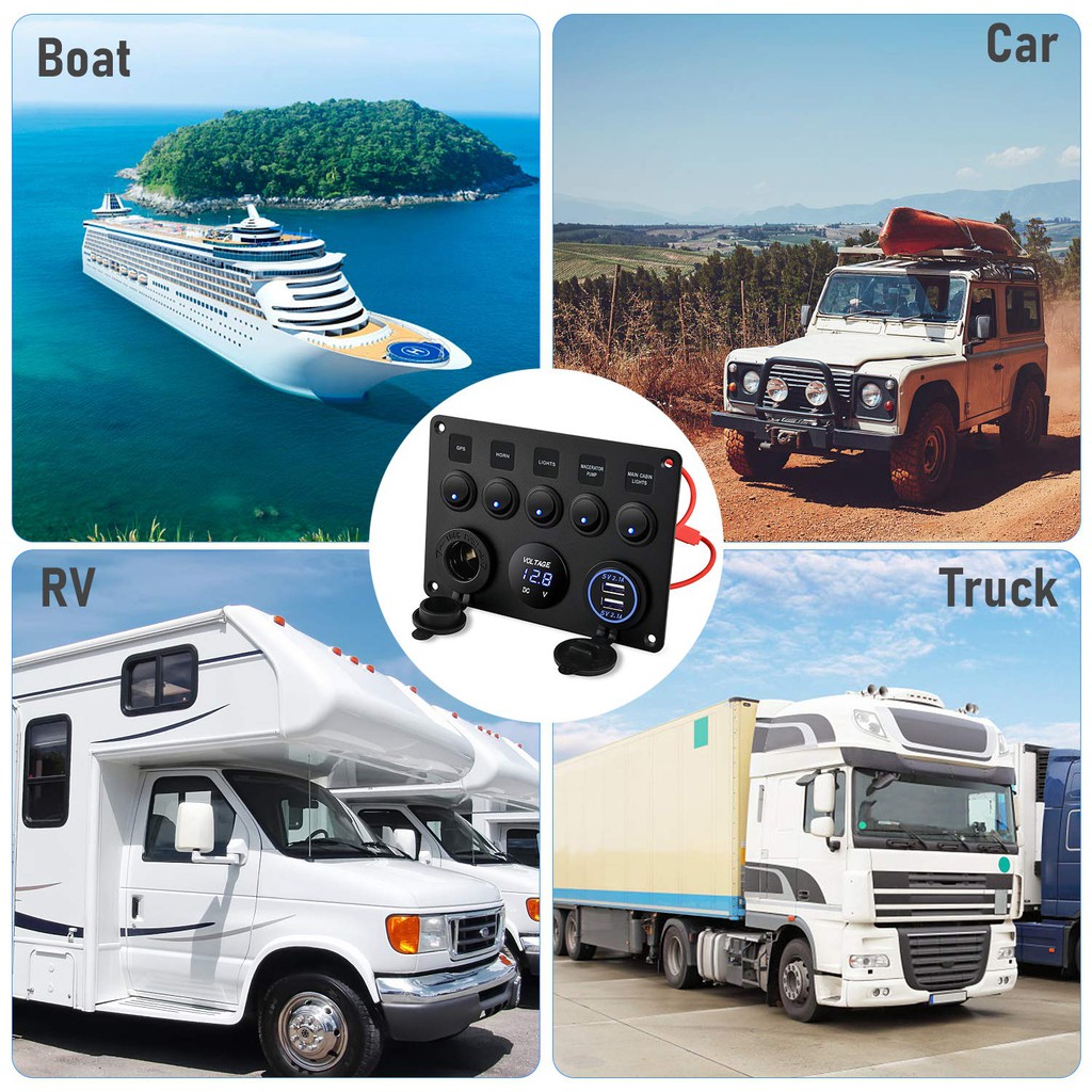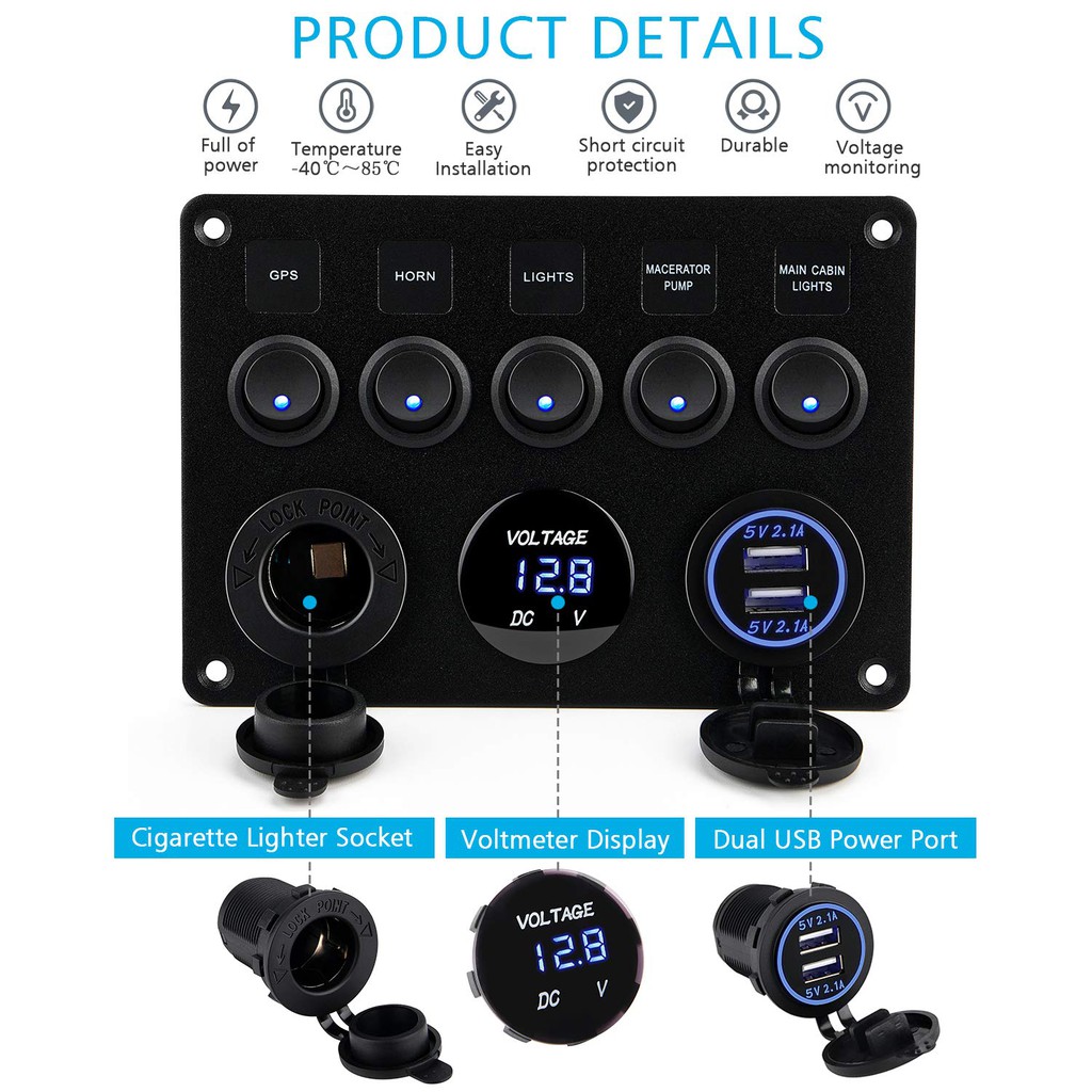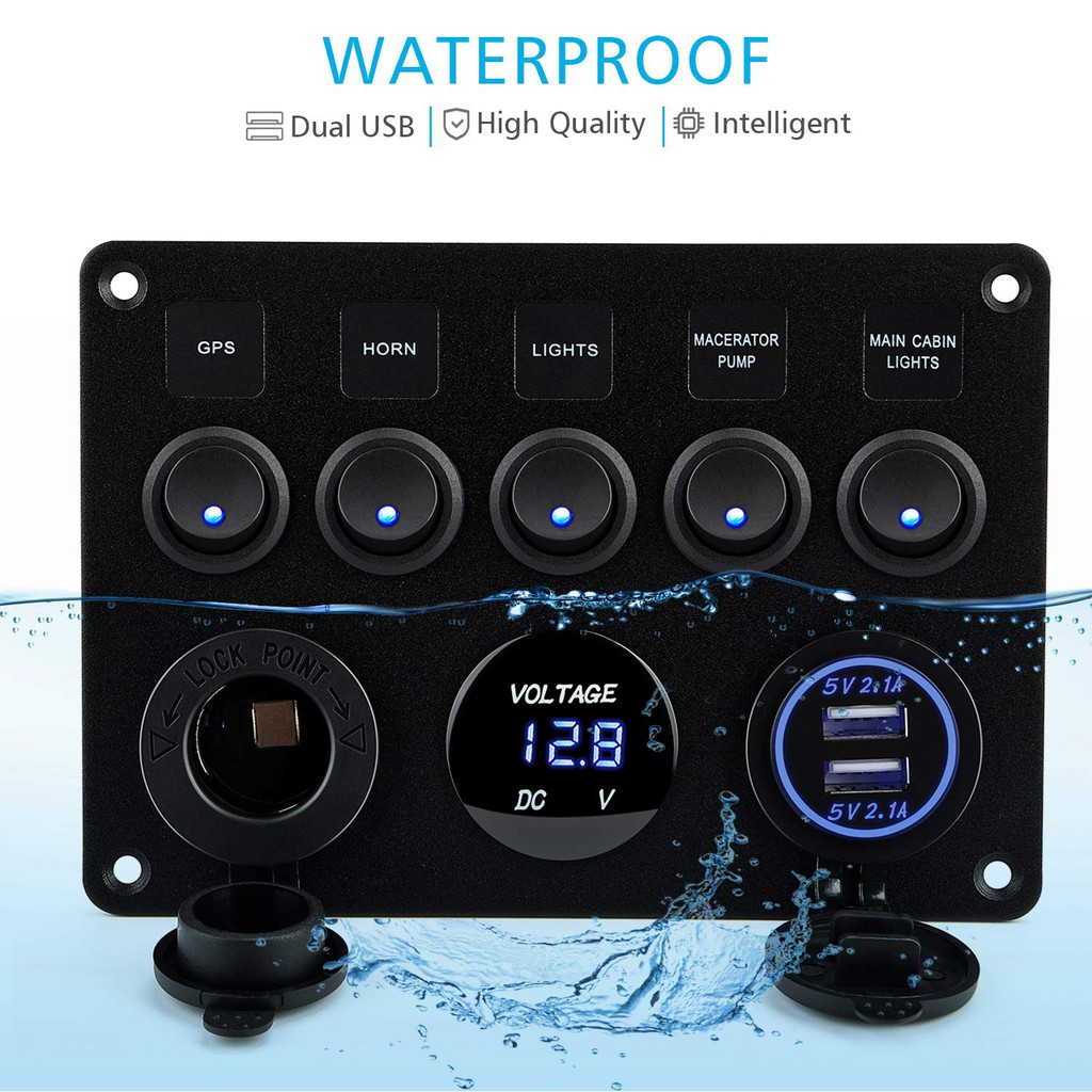 5 Gang Rocker Switch Panel 12V Waterproof for RV Boat Car Vehicles Truck Marine, Toggle Led Switch Panel Digital Voltmeter Display Dual USB Charger Port DC