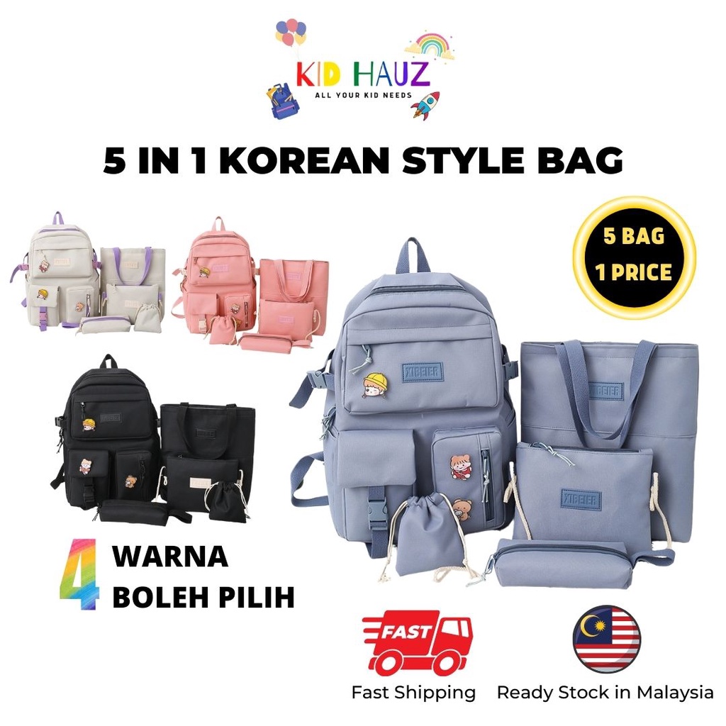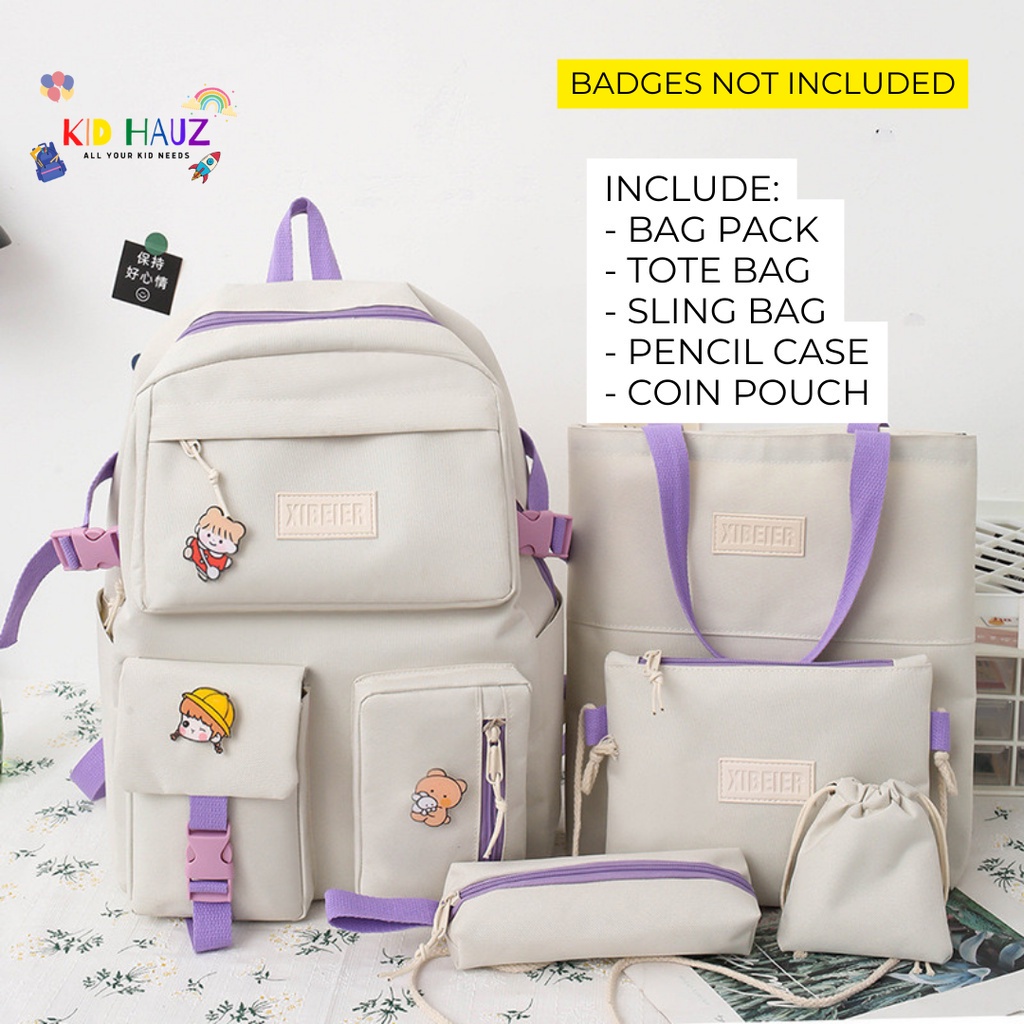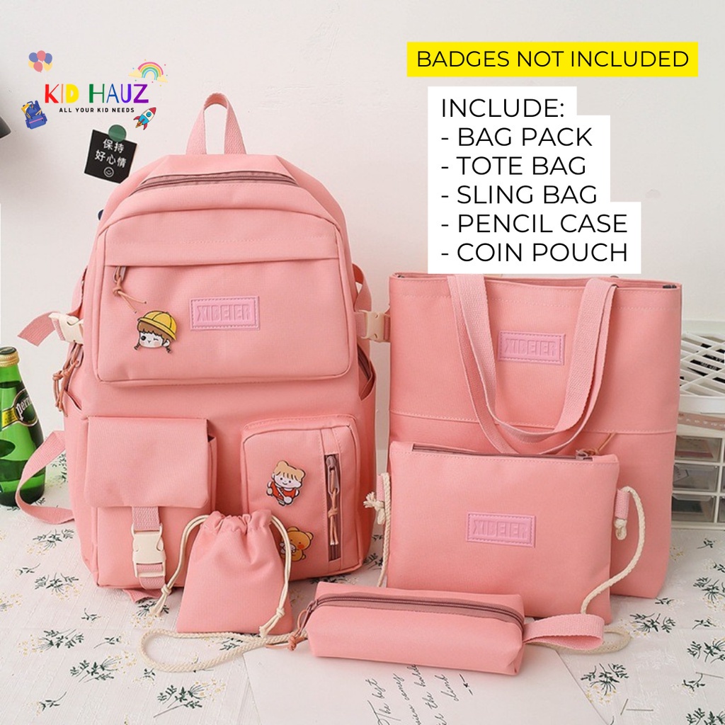 5 in 1 Korean Design School Bag Minimal Bagpack Totebag Slingbag Pencil Case Big Capacity Waterproof Student Bag Viral