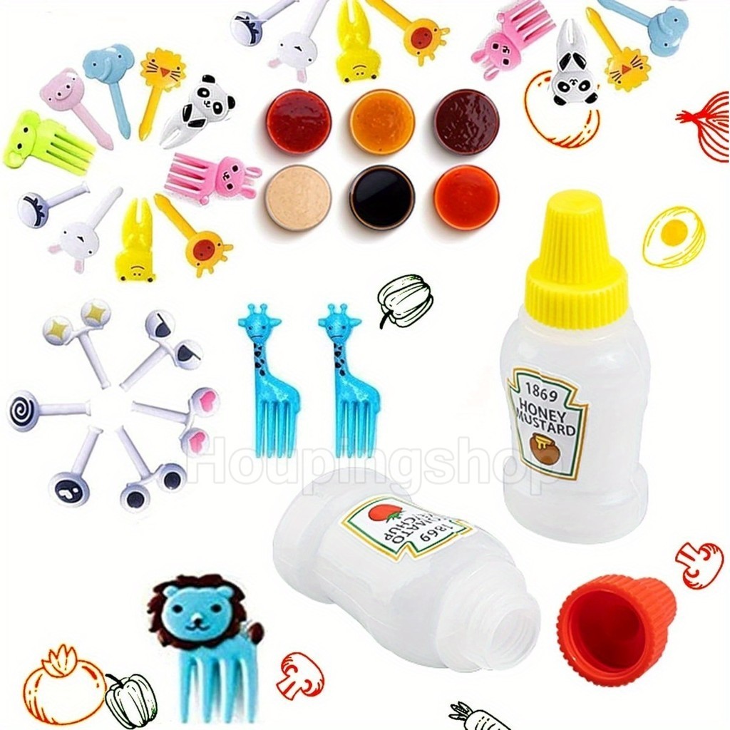 54pcs Mini Sauce Bottles Sauce Box Fruit Fork Set Squeeze Bottle Bento Box Small Sauce Containers Kitchen Tool School Lunch Box