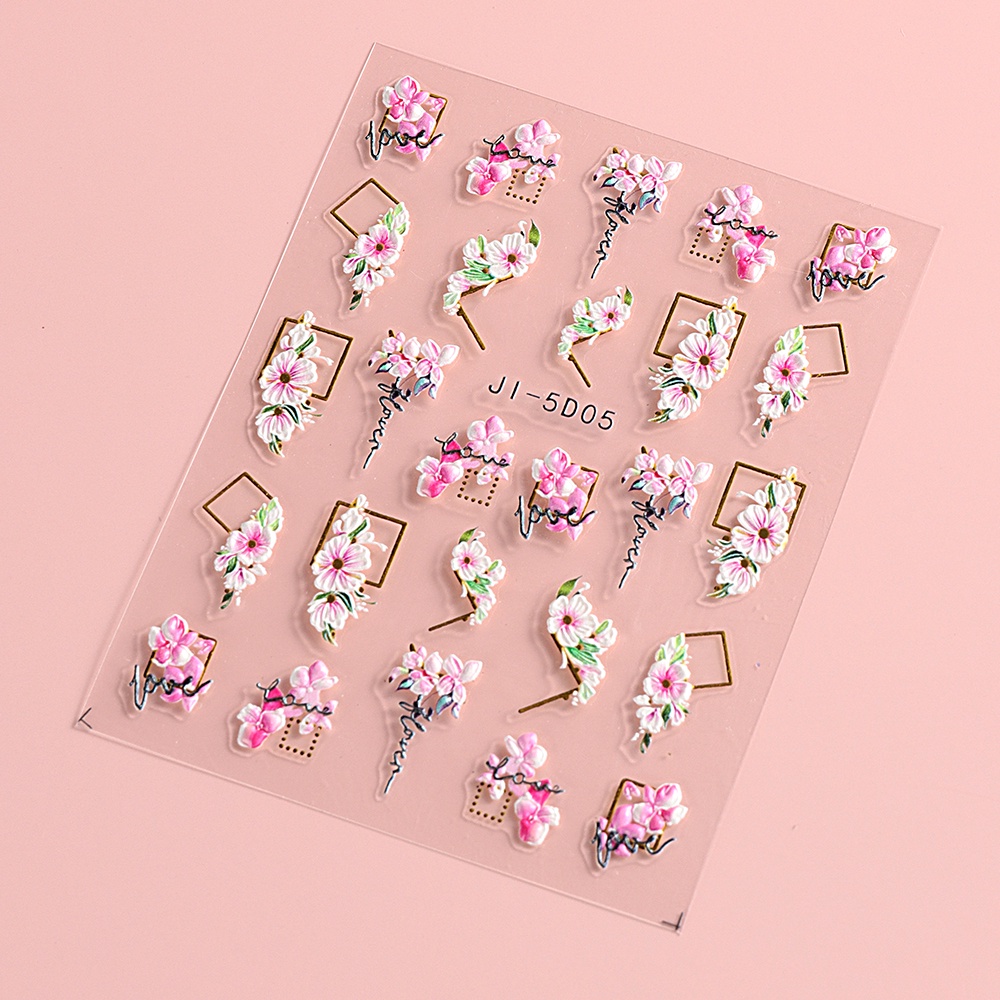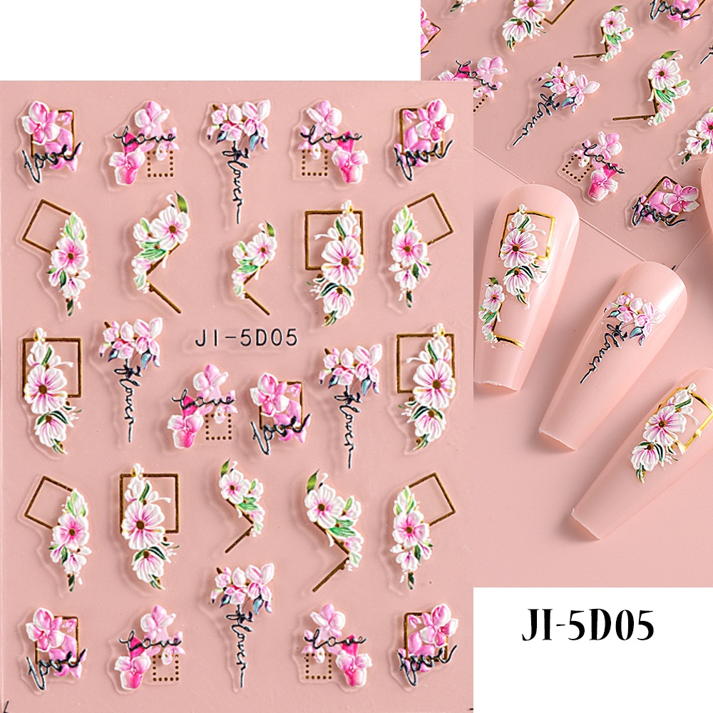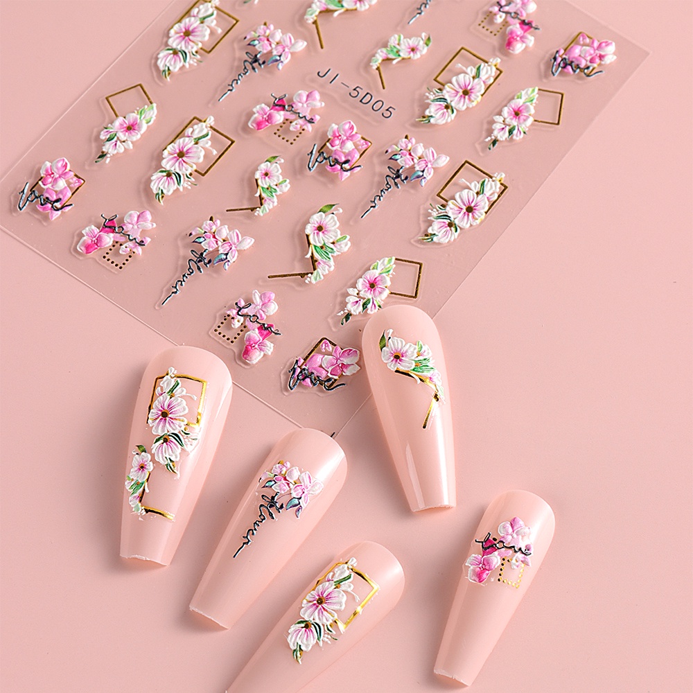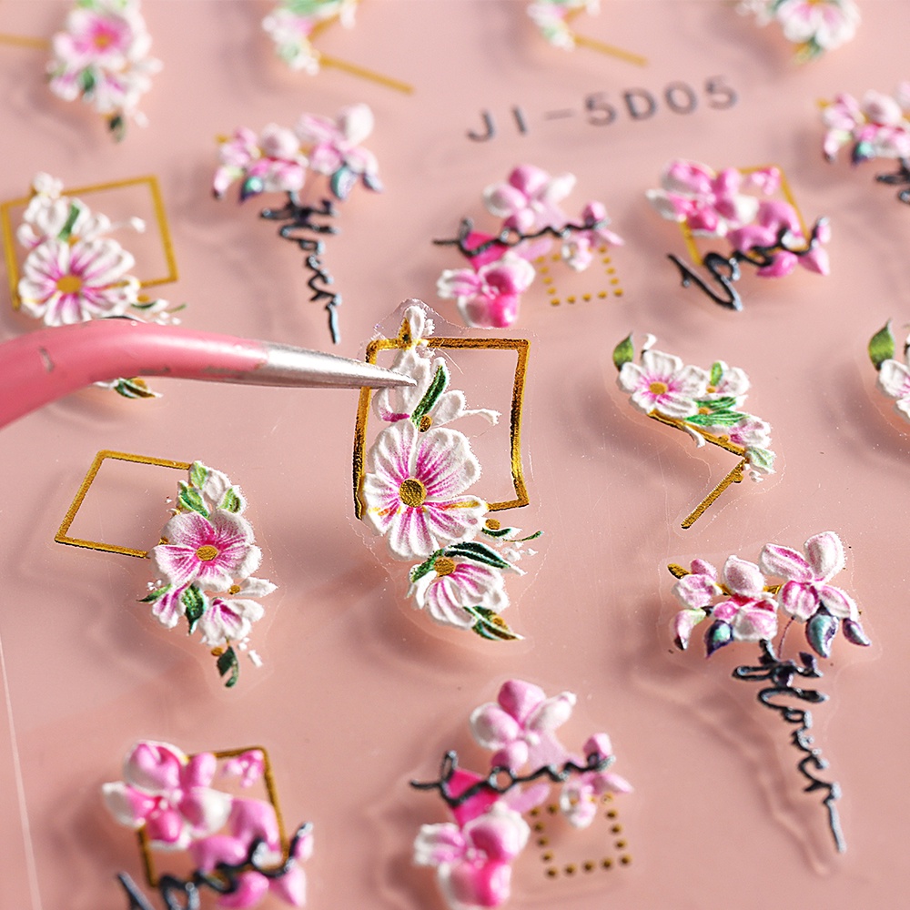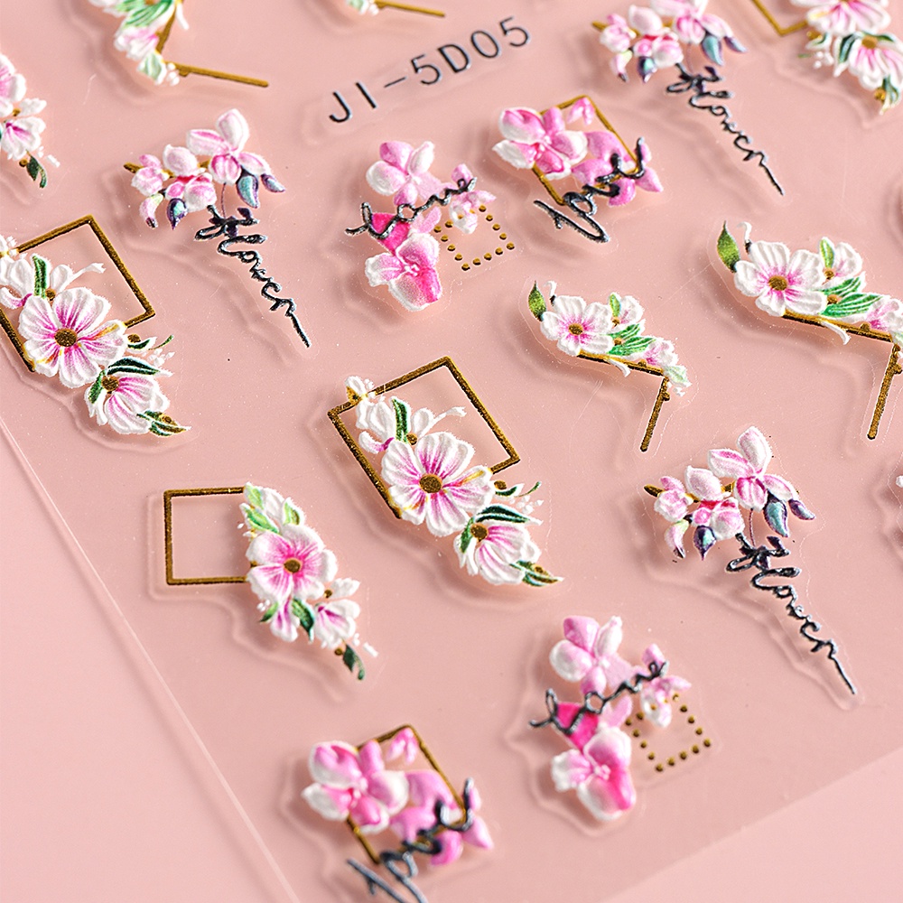 5D Nail Stickers Flowers Geometric Lines Decor Acrylic Embossed Sliders Gold Frame Nail Decals Cherry Blossom Manicure Tattoos