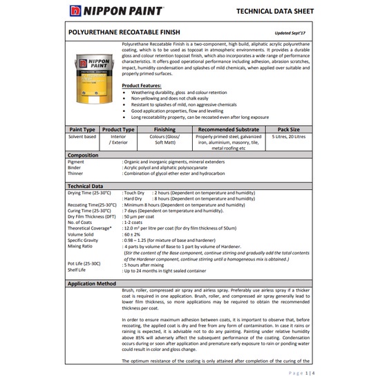 5L Nippon Paint PU Recoatable Finish Gloss / Soft Matt