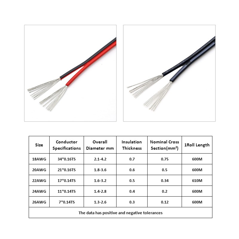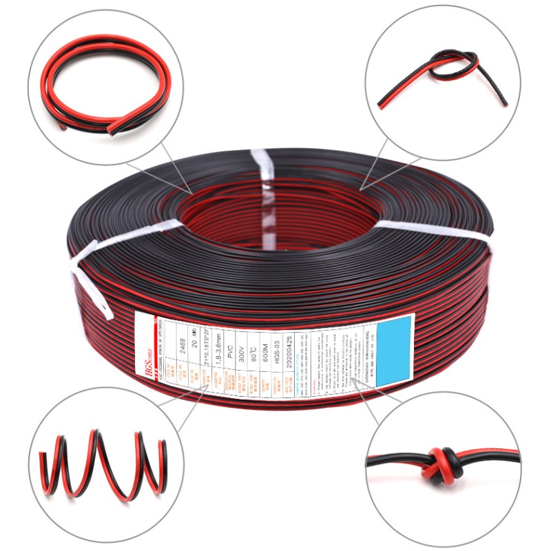 5Meters UL2468 2P Flat Ribbon Cable Double Row Wire Tinned Copper PVC Black Red 18AWG 20AWG 22AWG 24AWG 26AWG