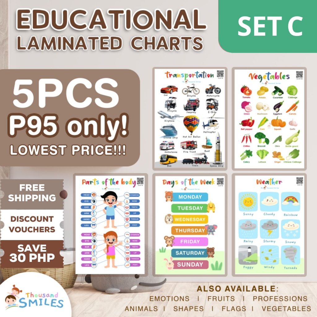 5PCS Kids Educational Wall Chart Laminated Poster A4 size Alphabet Abakada Abc Colors Shapes Numbers