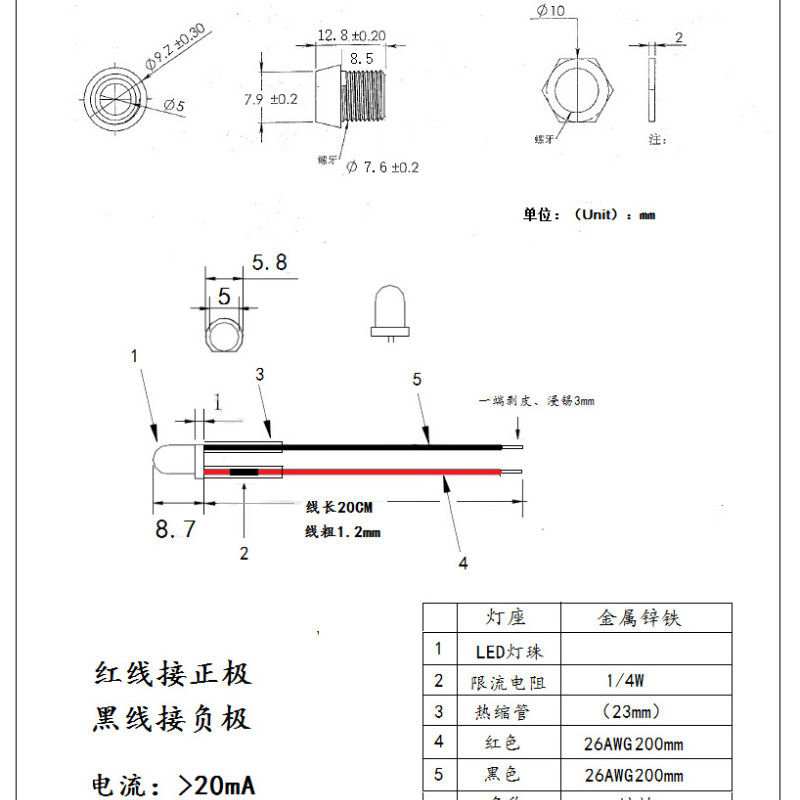 5Pcs 5mm LED with Wire Socket Pre-Wired LEDs Bulb 5V 12V 24V Emitting LED Diode with 20cm Wire Signal Indicator Lights 8mm Panel Mount