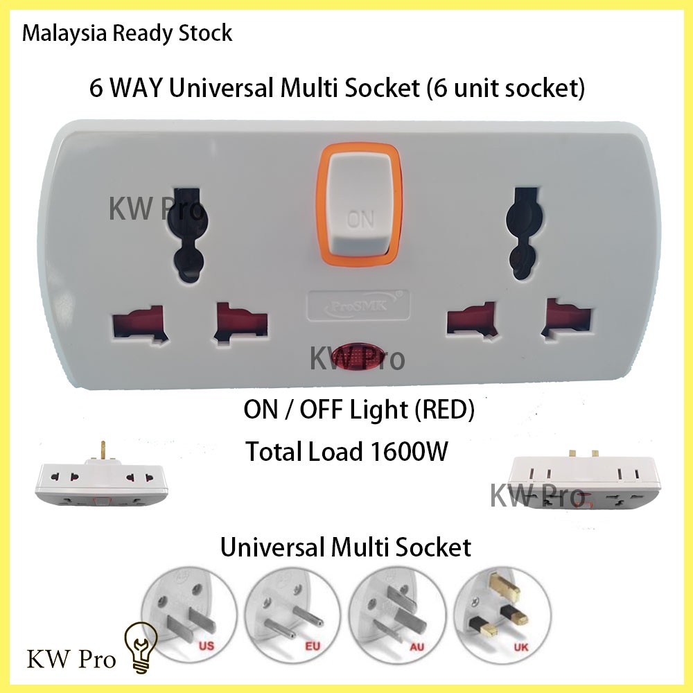 6 WAY Universal Multi Socket T-Adaport 3Pin and 2 PinExtension Plug Neon Indicator