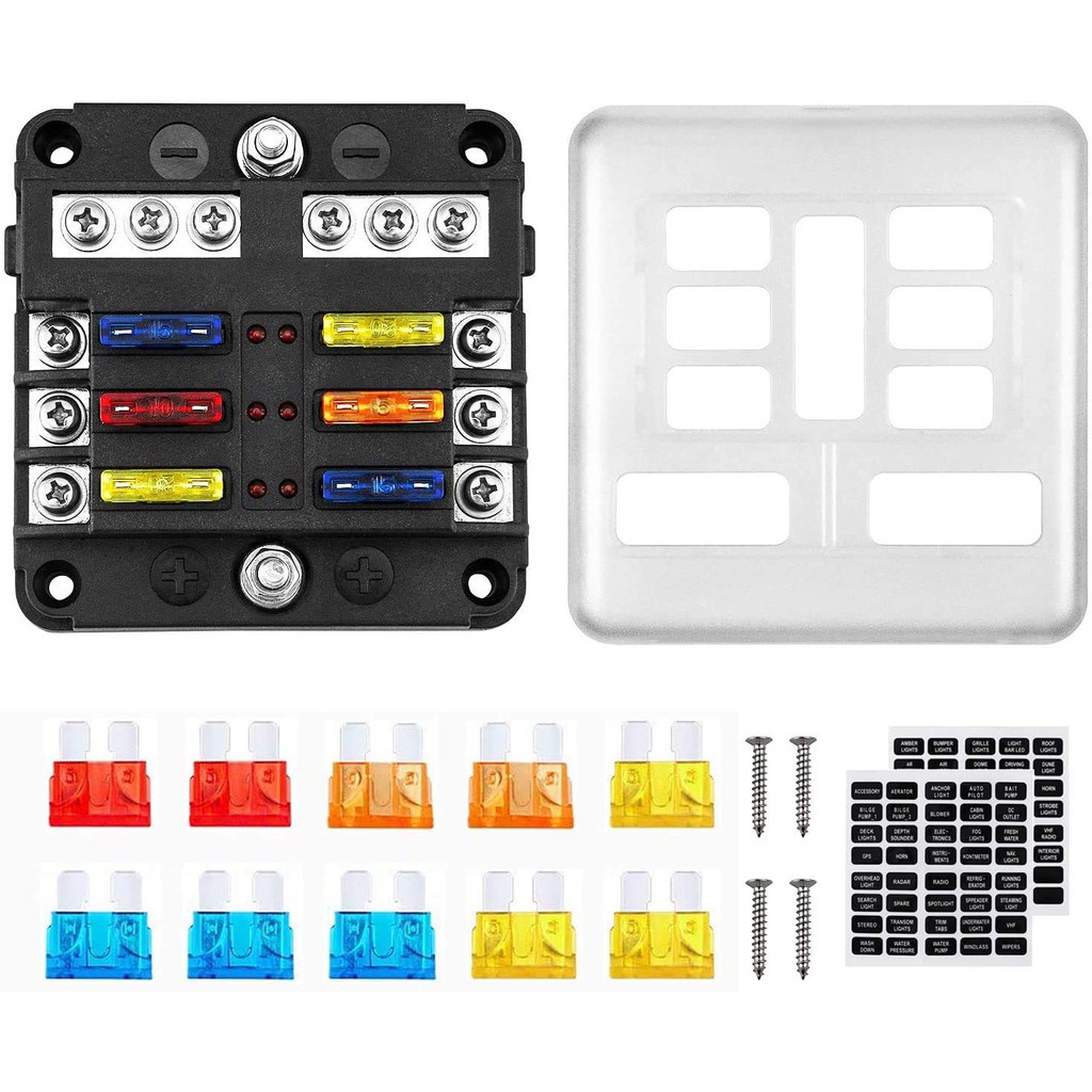 6 Way 12V Blade Fuse Block 12 Volt Waterproof Fuse Box Holder, 6 Circuit W/Negative Bus Fuse Box with LED Indicator for 12V/24V Automotive Truck Boat Marine RV Van Vehicle