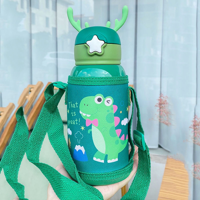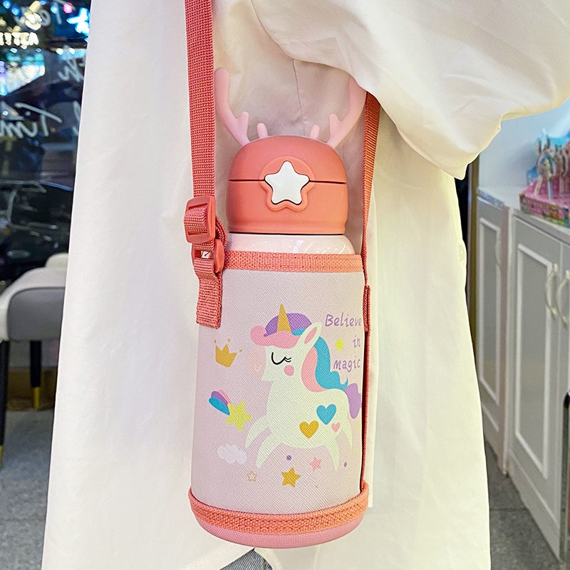 600ml Kids Child Vacuum Thermal Flask Cup Cute Cartoon Long Lasting Rabbit with Pouch Straw Stainless Steel