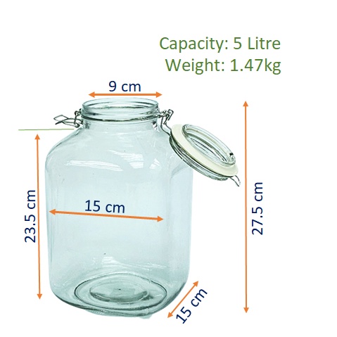 6500 5 Litre Glass Sqaure Clip Jar | Air Tight Glass Jar | Preserving Jar With Snap Closure